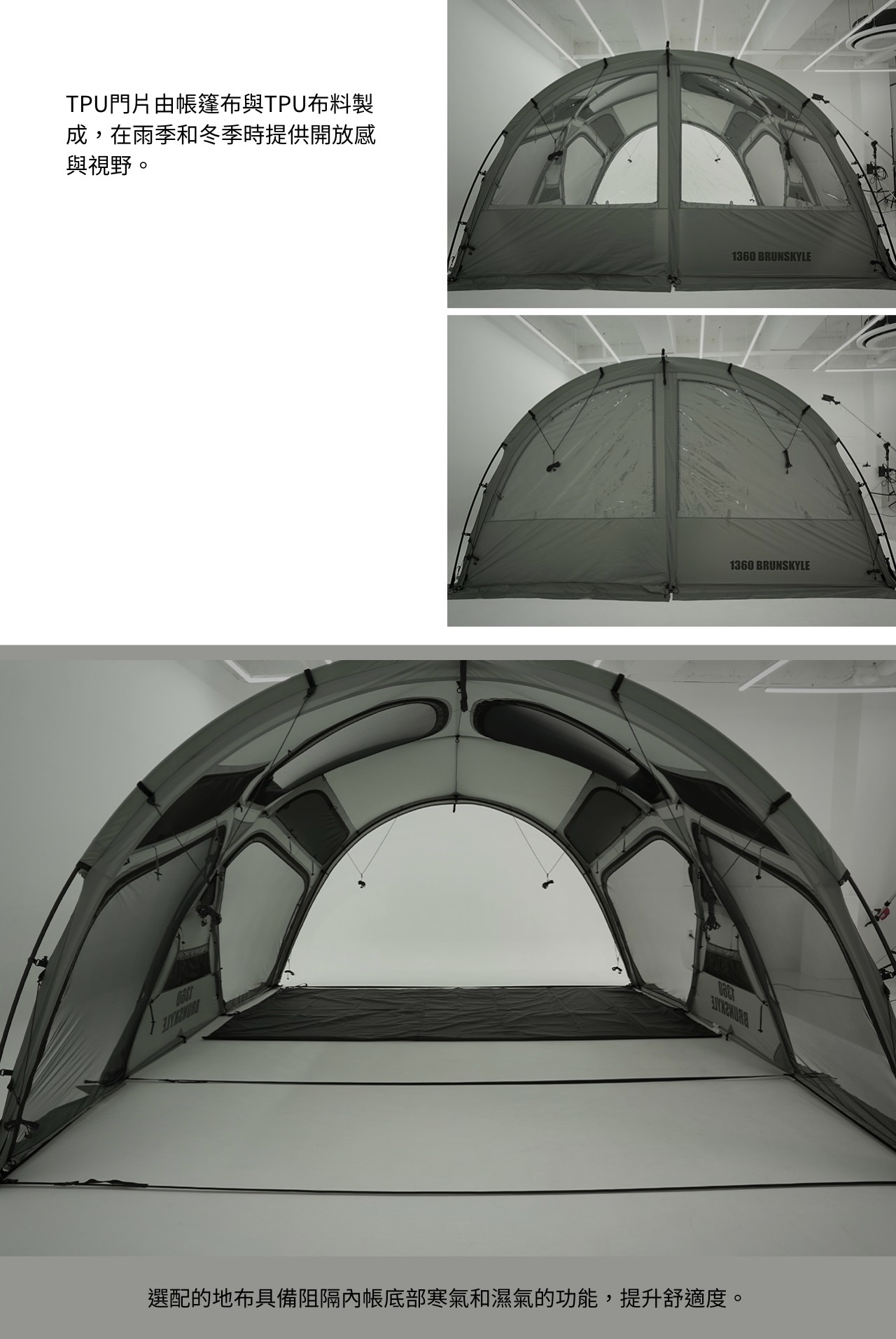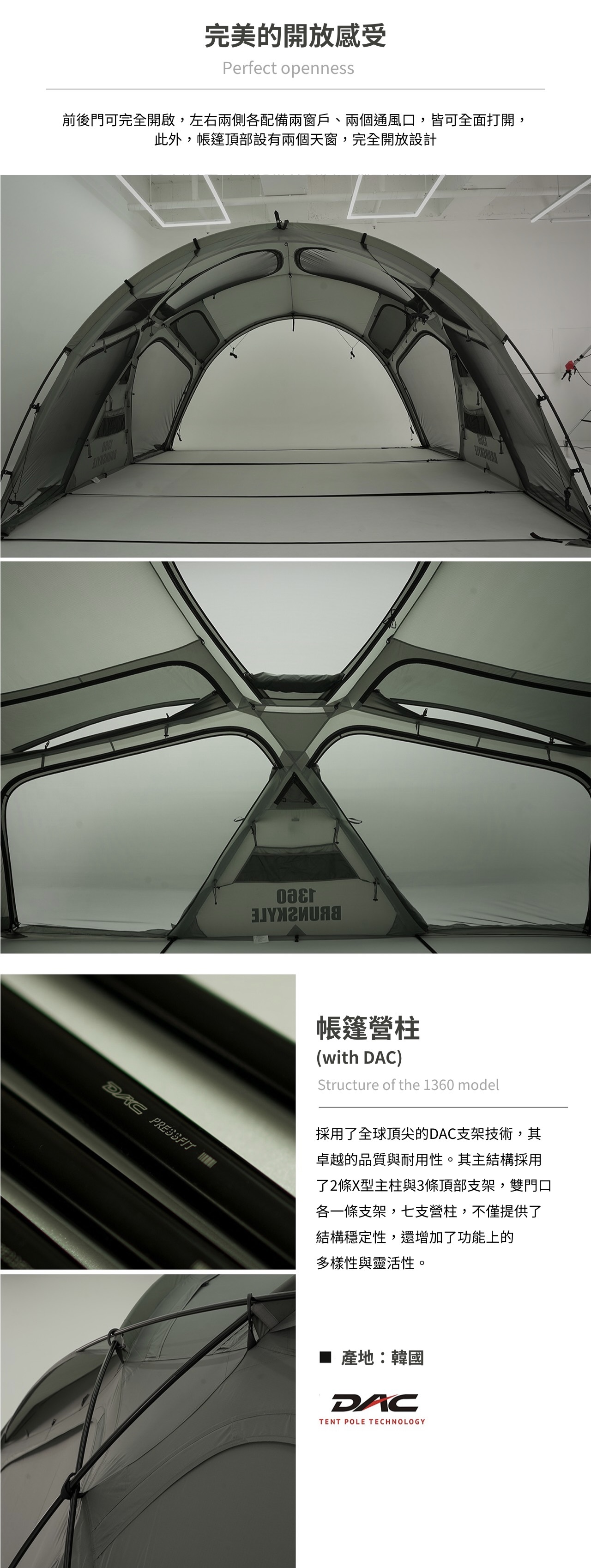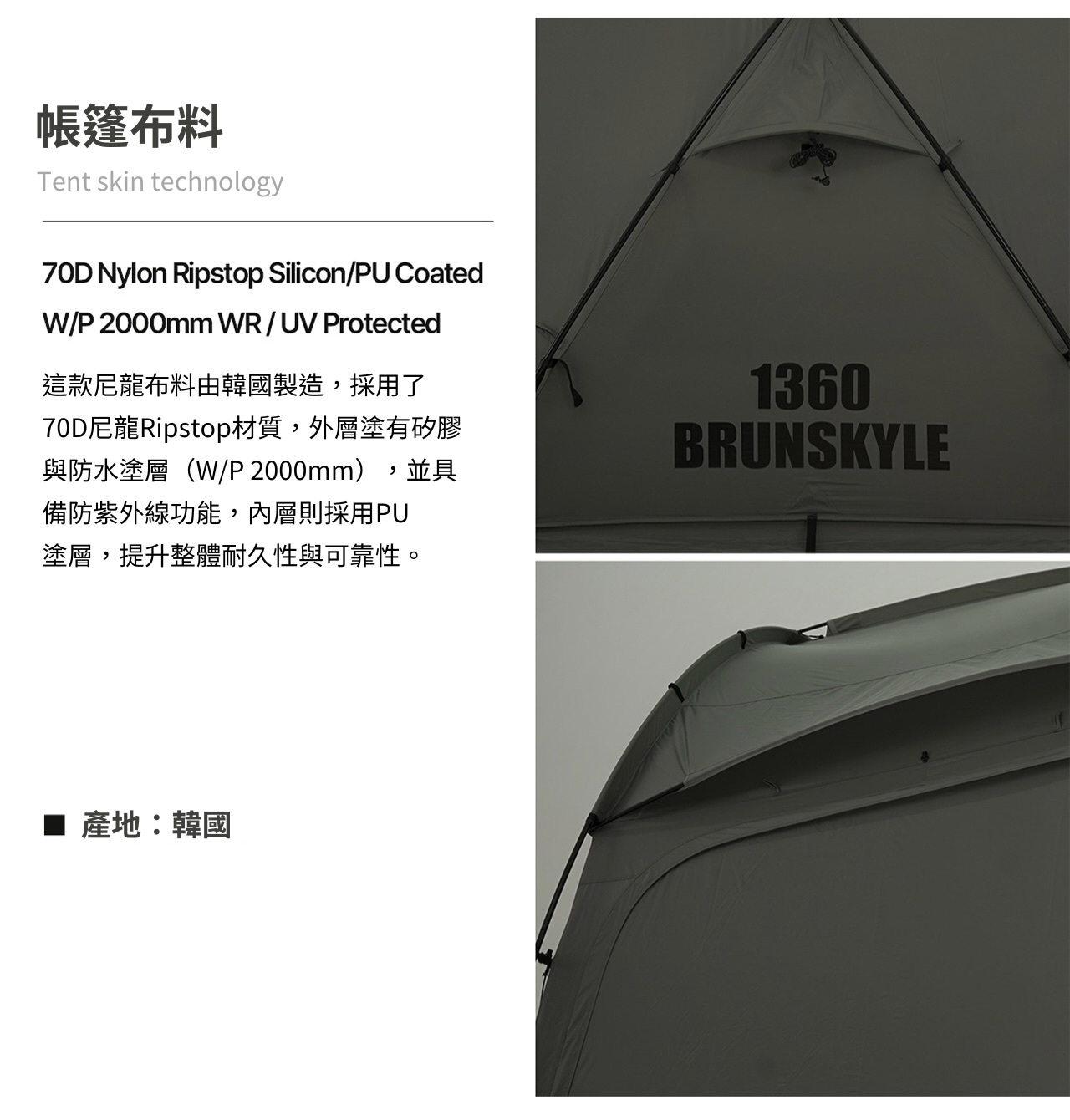 來自韓國的1360 結合未來主義與經典軍事風格,帳篷主體布料為70D尼龍材質,具優秀防水與UV防護性,採用高端DAC帳篷營柱,提供穩定結構與多功能性,內部全方位開放的設計,配備多通風口與排水系統,提供舒適與便利的露營體驗。