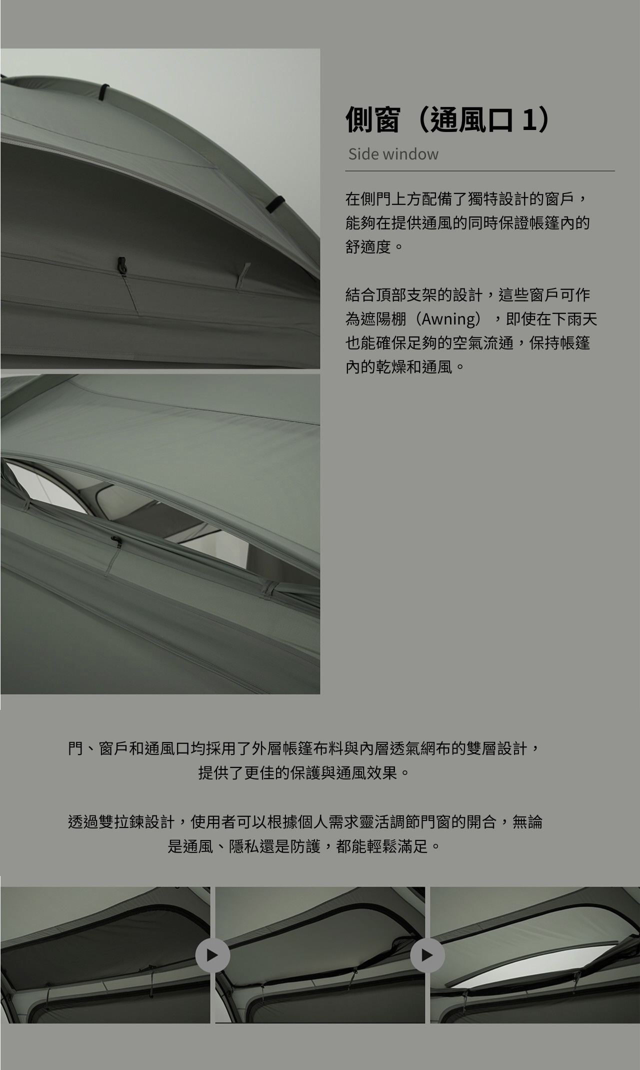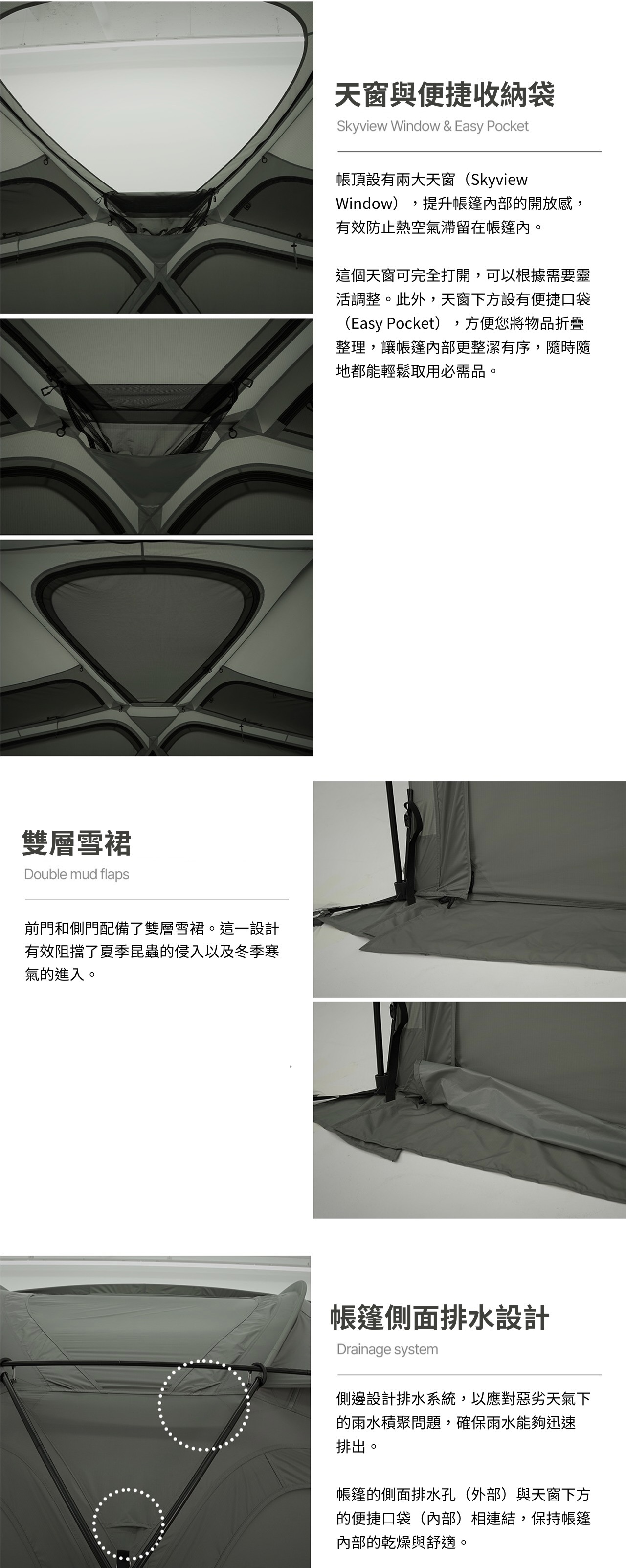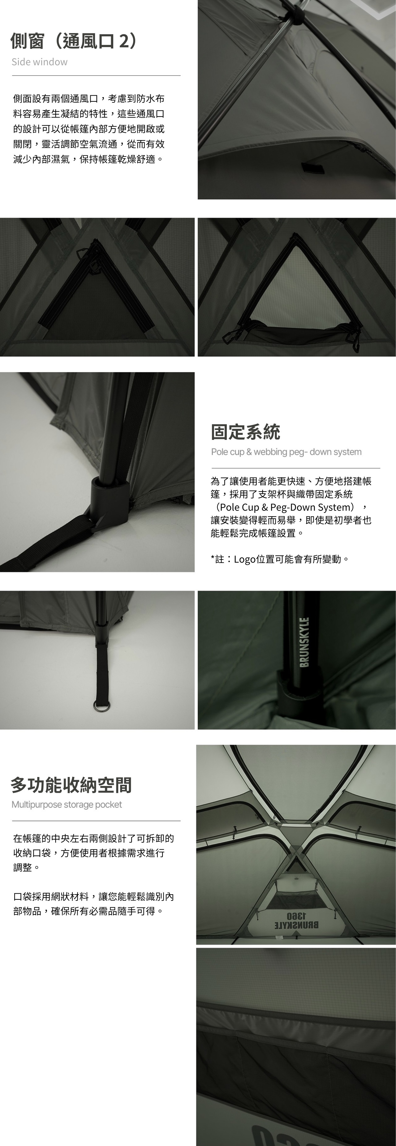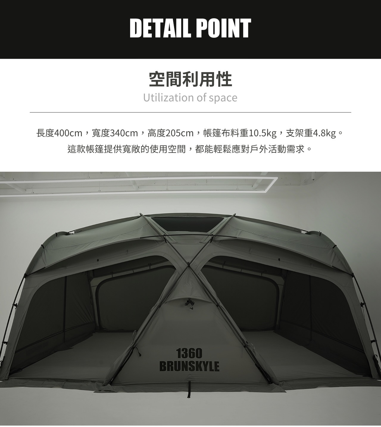 來自韓國的1360 結合未來主義與經典軍事風格,帳篷主體布料為70D尼龍材質,具優秀防水與UV防護性,採用高端DAC帳篷營柱,提供穩定結構與多功能性,內部全方位開放的設計,配備多通風口與排水系統,提供舒適與便利的露營體驗。
