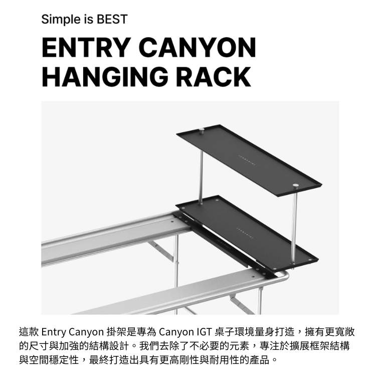這款掛架是專為 Canyon IGT 桌系統 量身設計的擴充配件。設計團隊秉持極簡主義,去除了所有不必要的元素,專注於結構的穩定性與空間利用率。