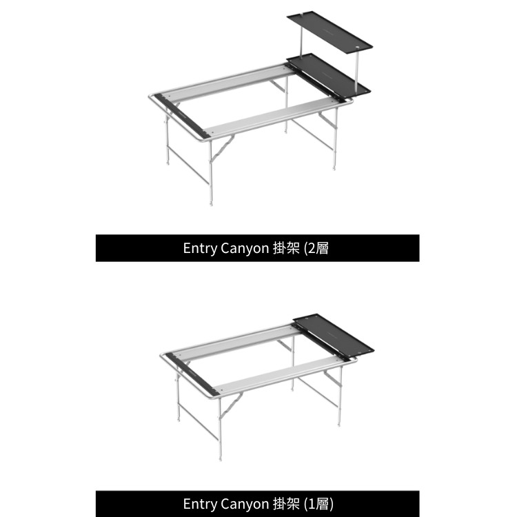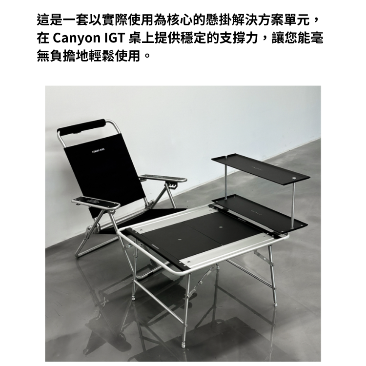 透過加寬的尺寸與強化的框架結構,為您的露營桌面提供更高的耐用性與實用的懸掛收納空間。