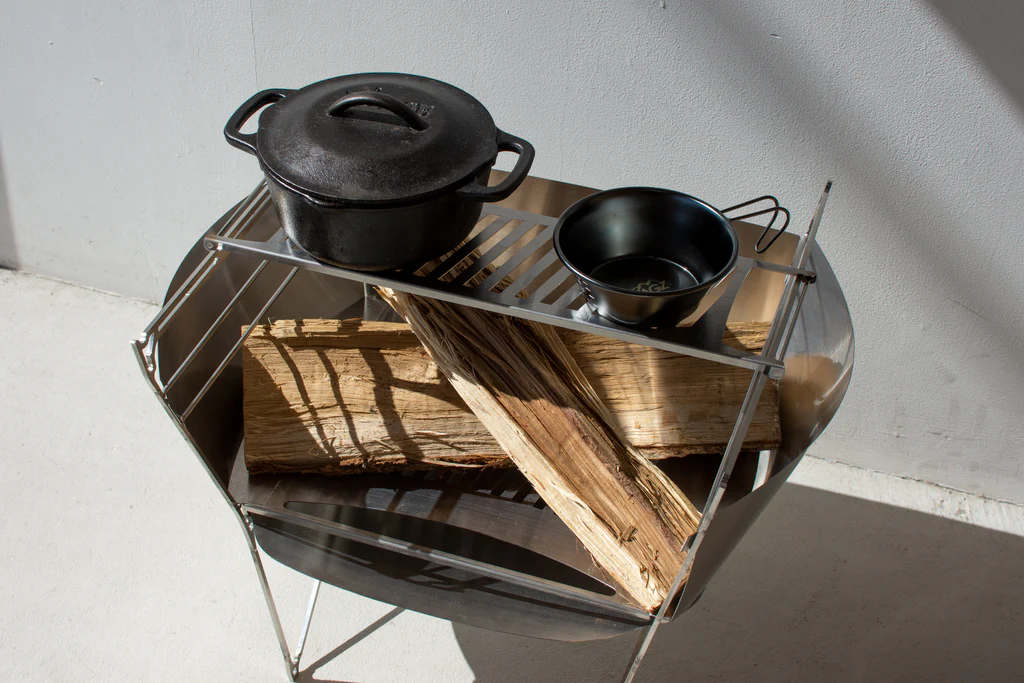 了防止因篝火的熱量變形,將烤網兩端彎曲並焊接強化,儘管使用了厚度為1毫米的薄板材料,但仍實現了堅實的剛性,即使放置荷蘭鍋等重型炊具也能穩定使用。