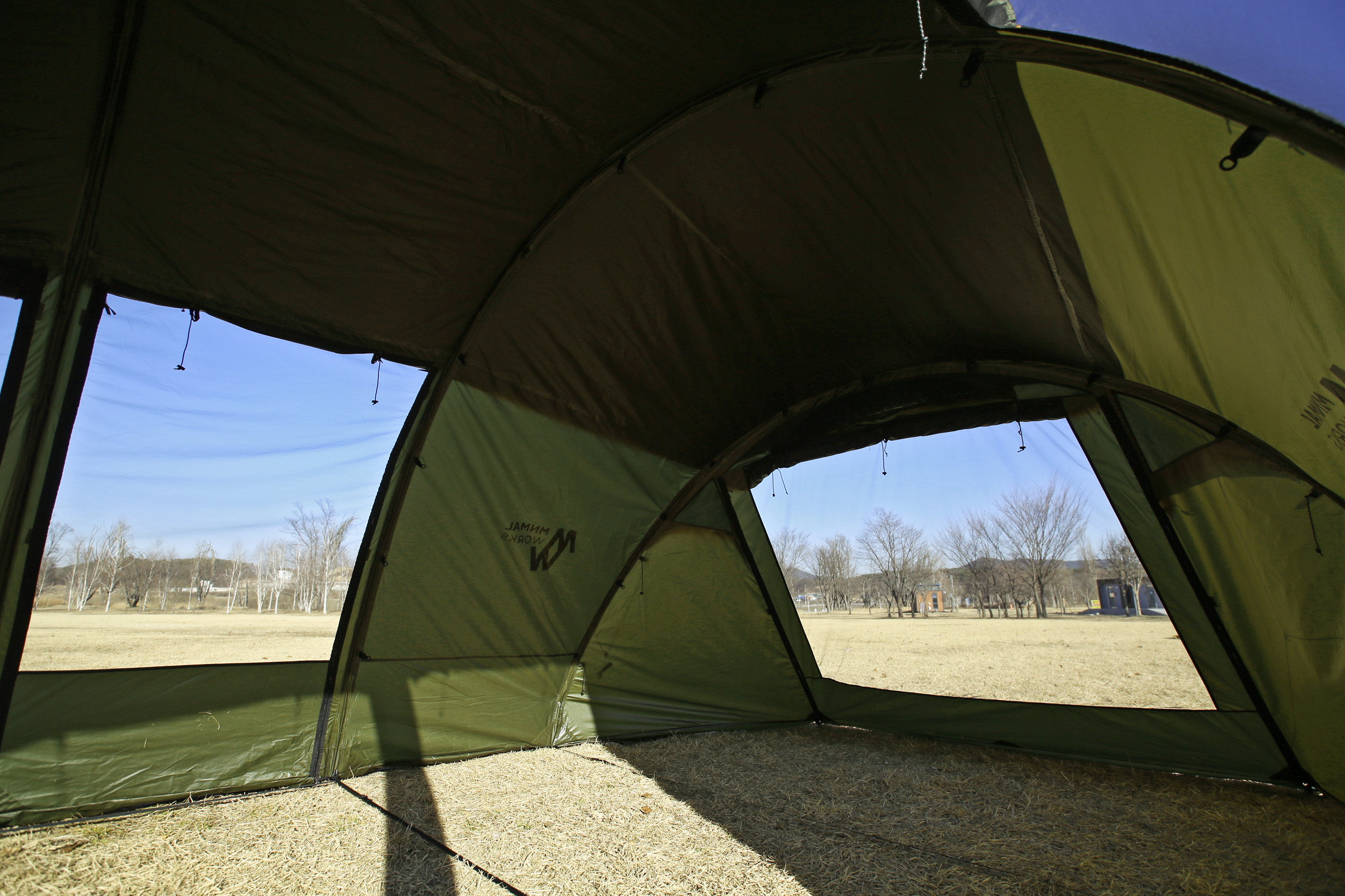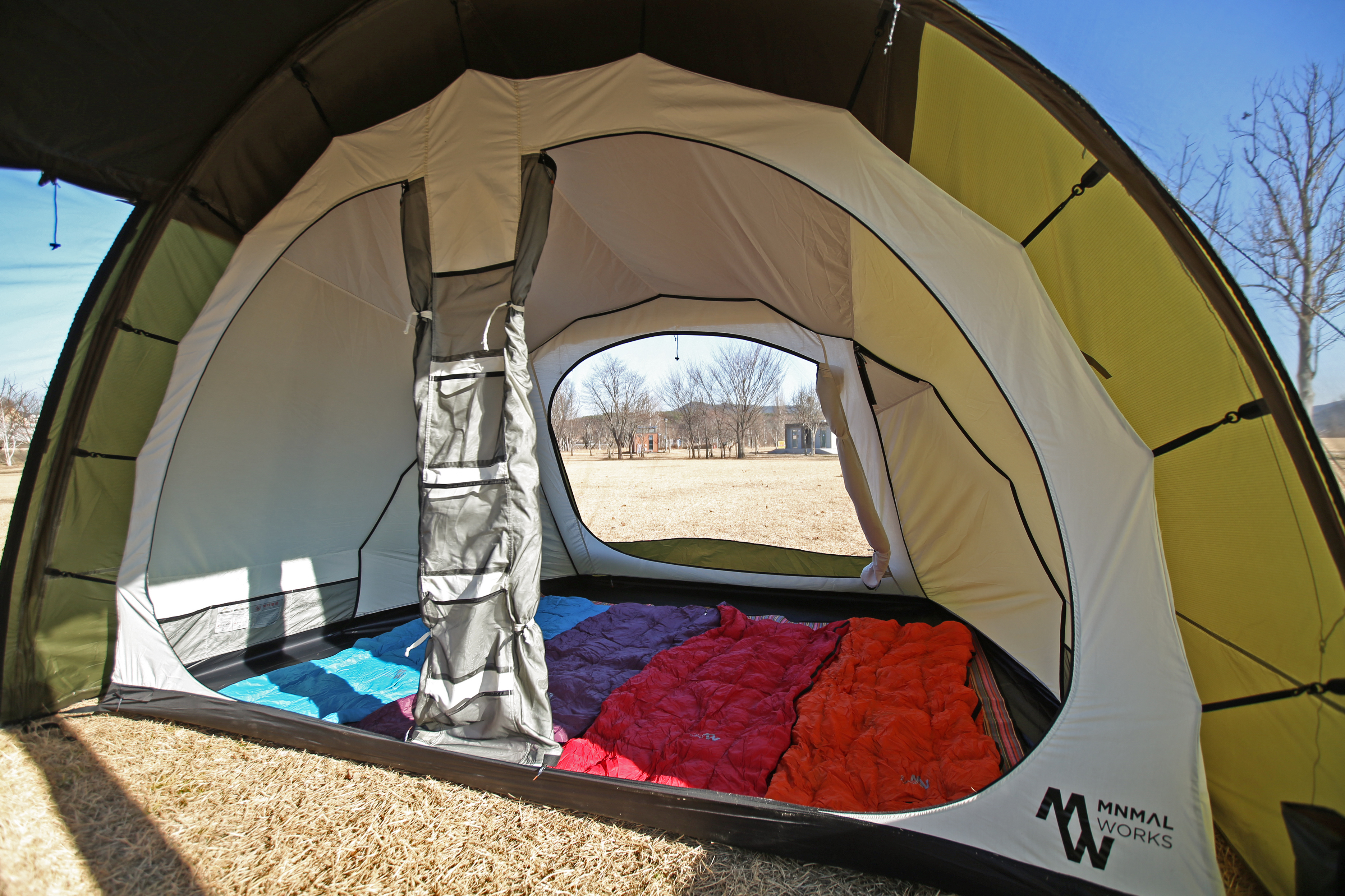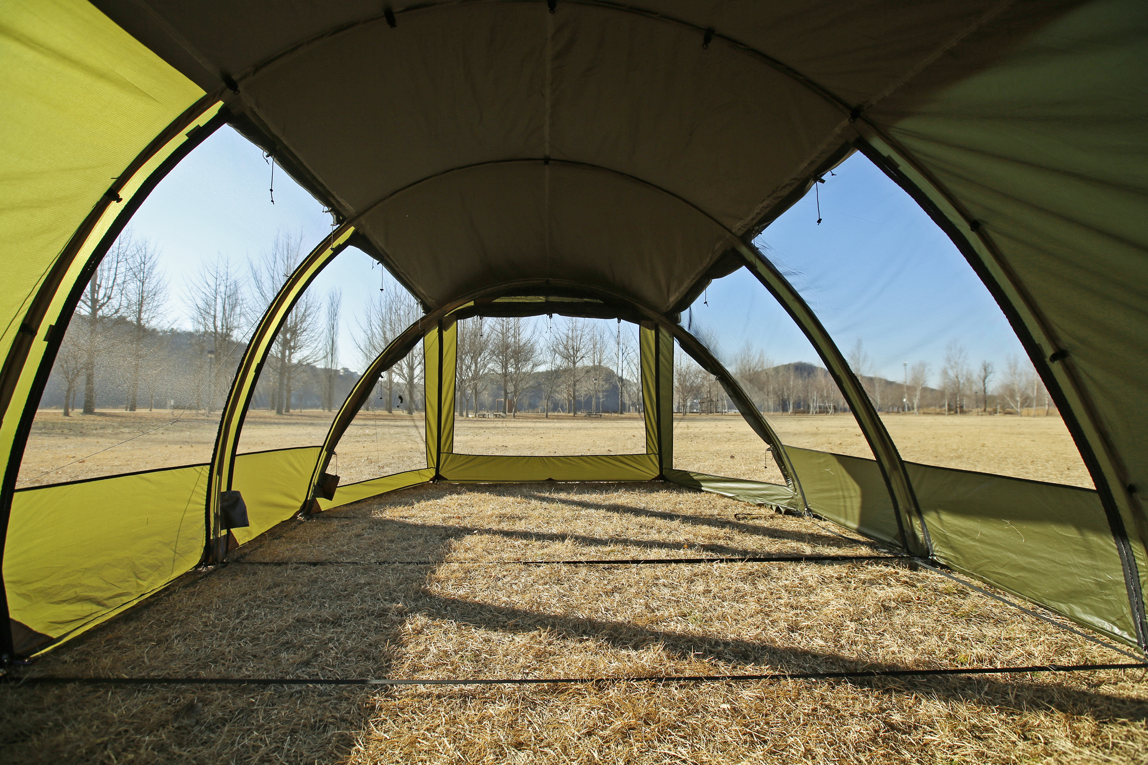 Albergue是一個隧道式的帳篷,提供了充足而悠閒的空間,空間利用率高。門片可以根據需要用作窗戶或門,夏天給人涼爽的開放感,冬天可以營造溫暖的空間。