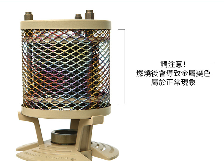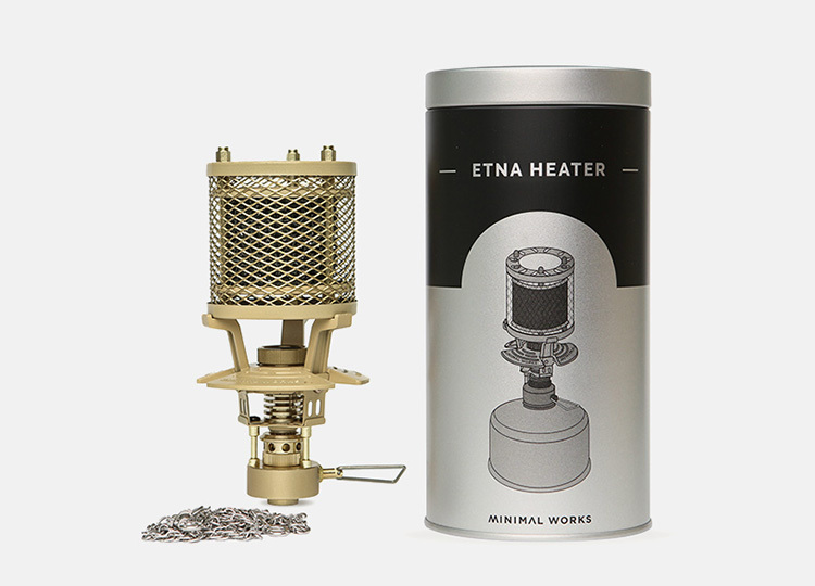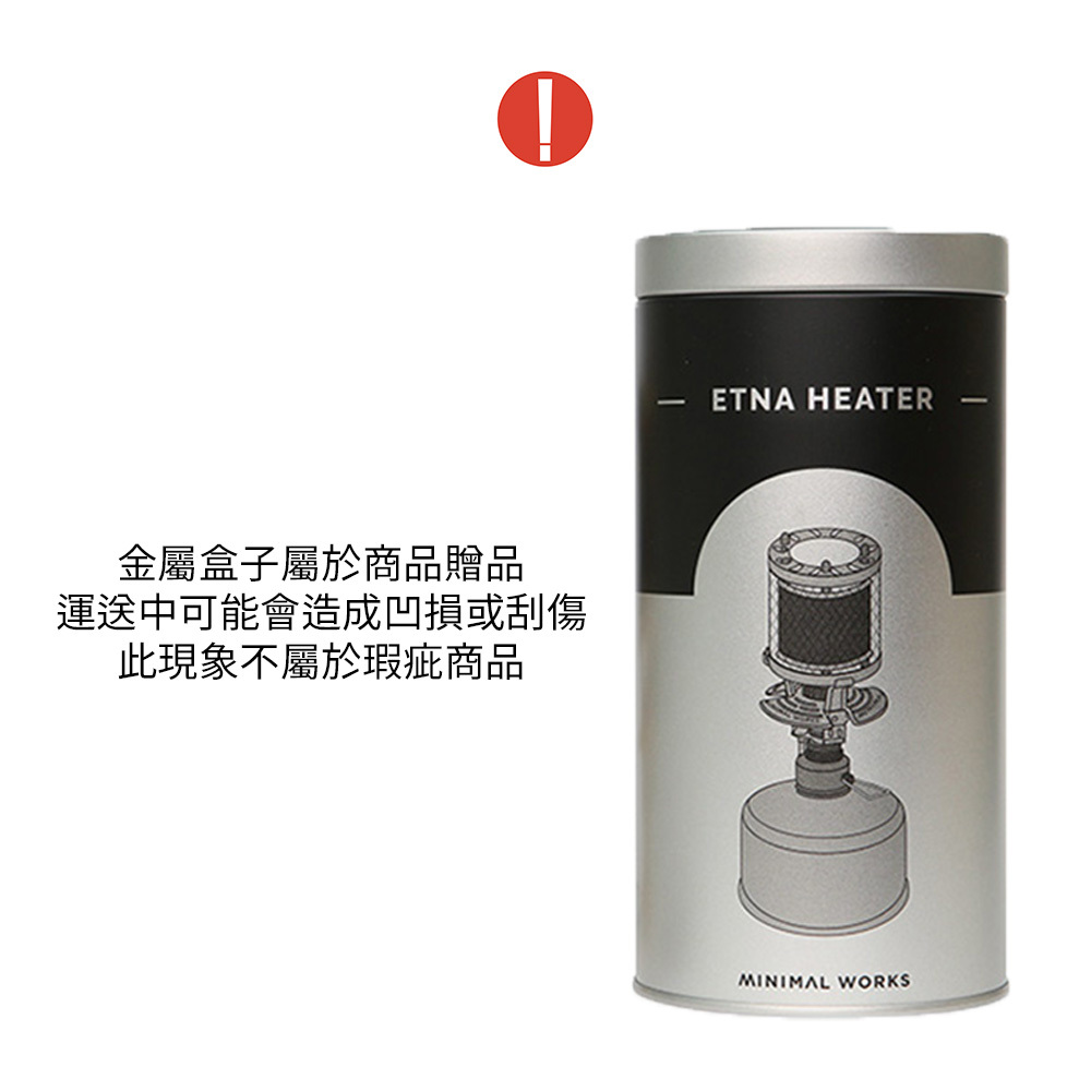 埃特納氣氛瓦斯暖爐是Minimal Works與韓國知名煤氣公司合作生產,加熱輸出功率更加穩定,設計想法是出自歐洲最大活火山埃特納噴發的火焰,外表時尚具有獨特的美感、小而輕巧,比起其他笨重的暖爐,更適合露營攜帶使用。此設計為戶外使用,使用時會消耗大量氧氣,請勿在狹窄的空間或帳篷使用,避免發生一氧化碳中毒或窒息風險。