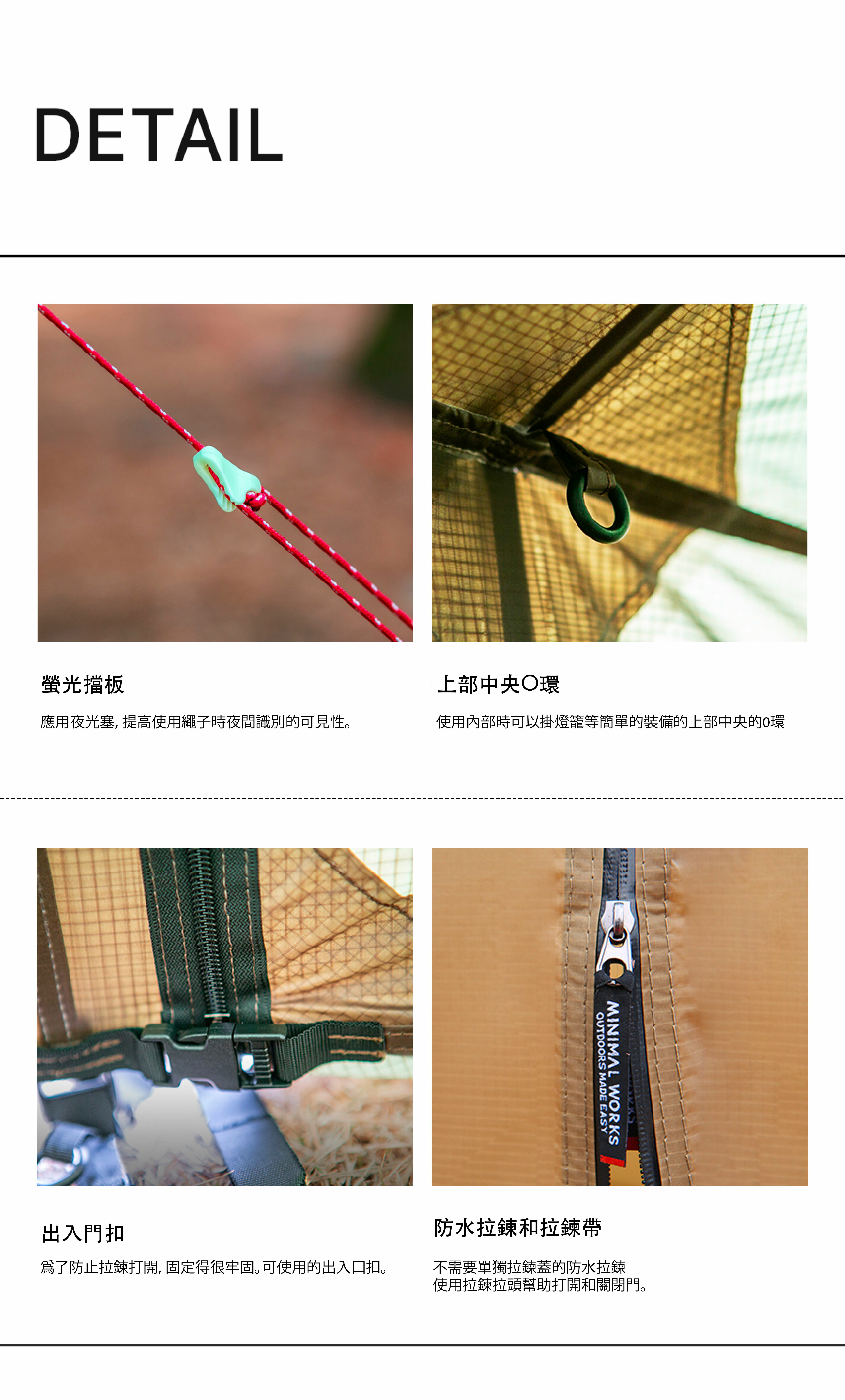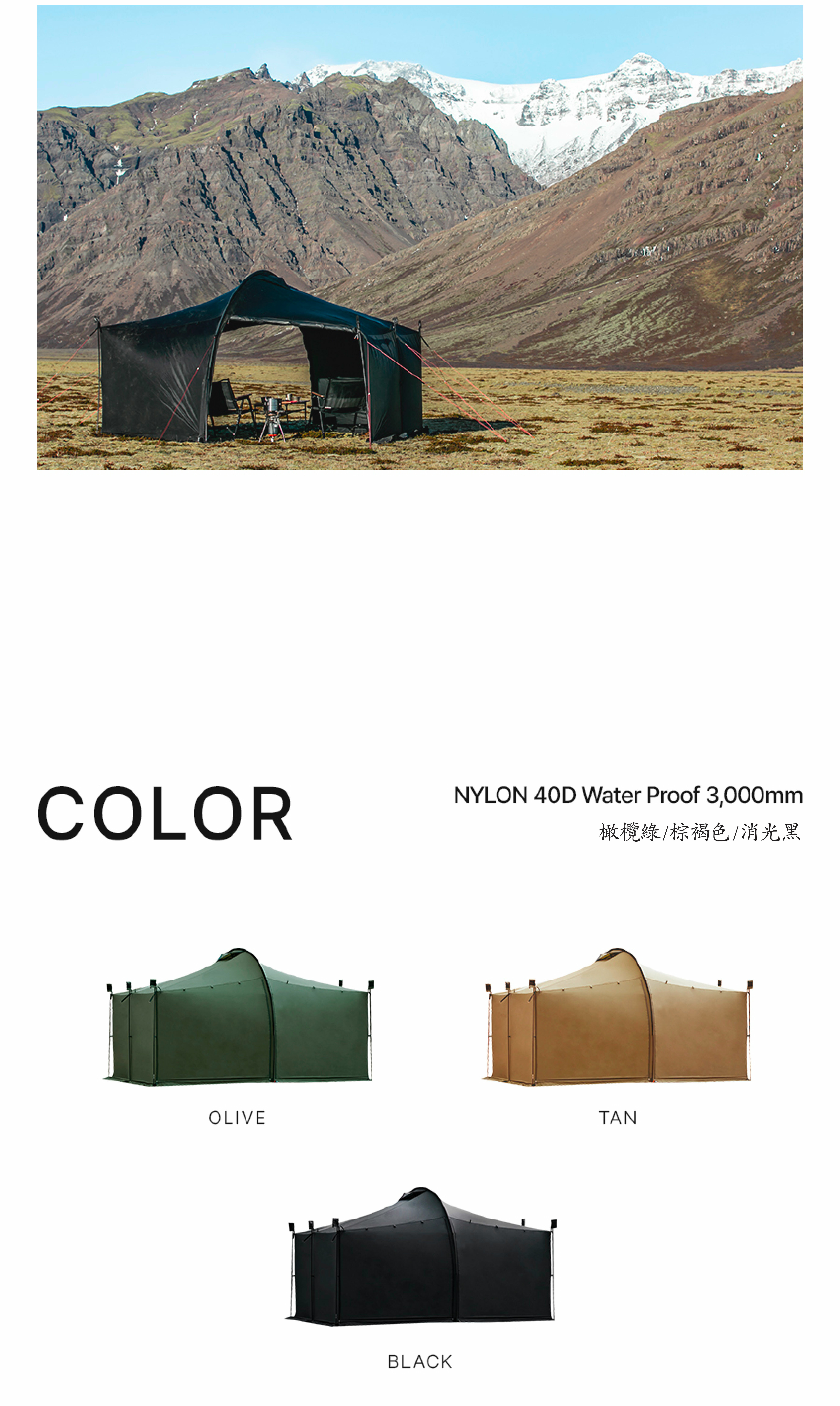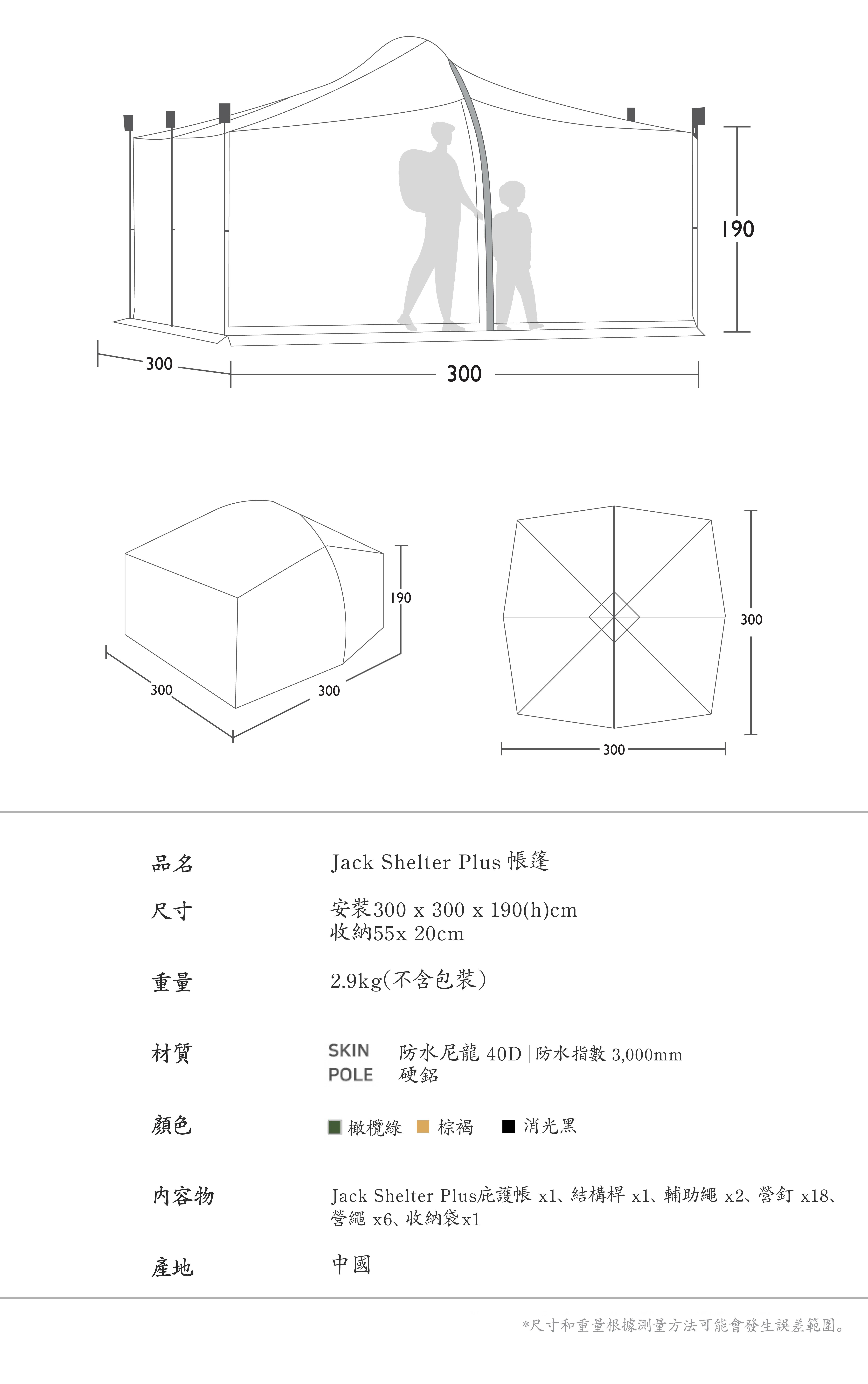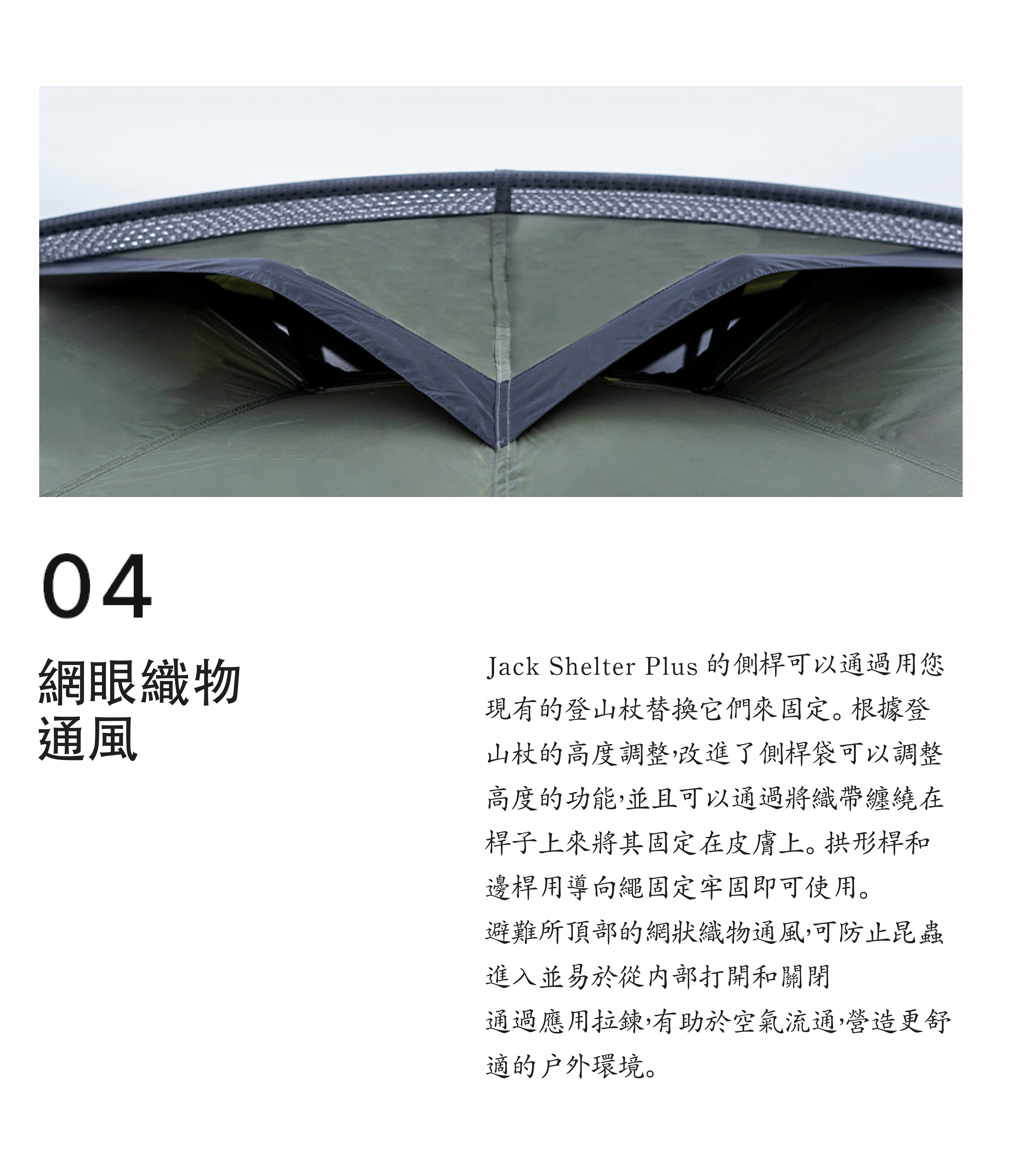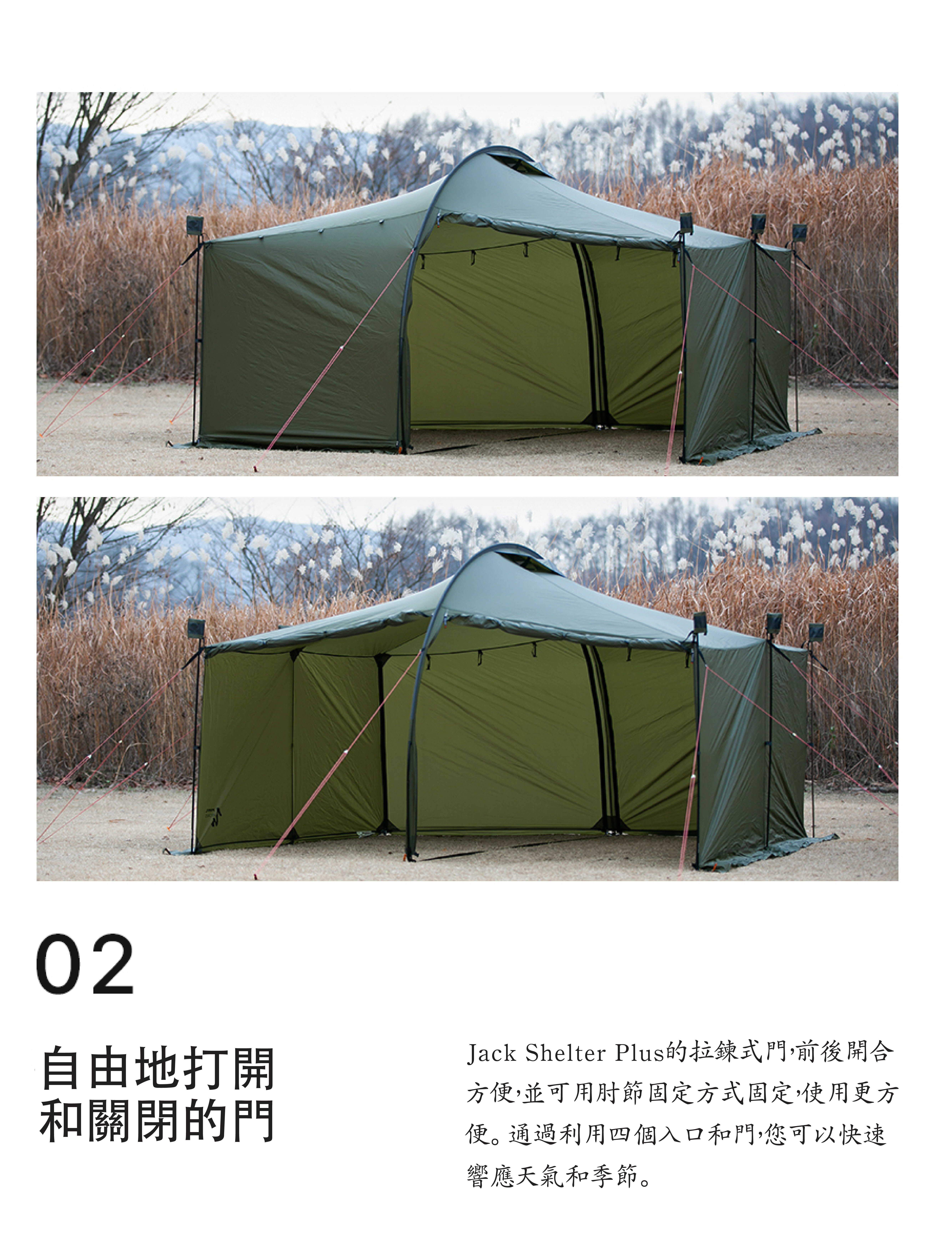 Jack Shelter Plus 是一款多功能團體庇護帳,可容納多人,其採用拱形桿結構和方形造型,消除了中心桿的空間限制,內部空間感極佳,能夠靈活應對天氣變化。 設計上採用拉鍊式開門,方便前後開合,並可用肘節固定方式固定,使用更方便。 通過利用四個入口和門,以可以快速反應天氣和季節的變化。Jack Shelter Plus 的側桿可以通過用您現有的登山杖來替換固定。 同時改進了側桿袋可以調整高度的功能,以根據登山杖的高度進行調整,並且可以通過將繩子纏繞在桿子上來將其固定在帳布上。 拱形桿和邊桿用導向繩固定牢固即可使用。帳篷頂部的網狀織物通風,通過易於從內部打開和關閉的拉鍊防止昆蟲入侵