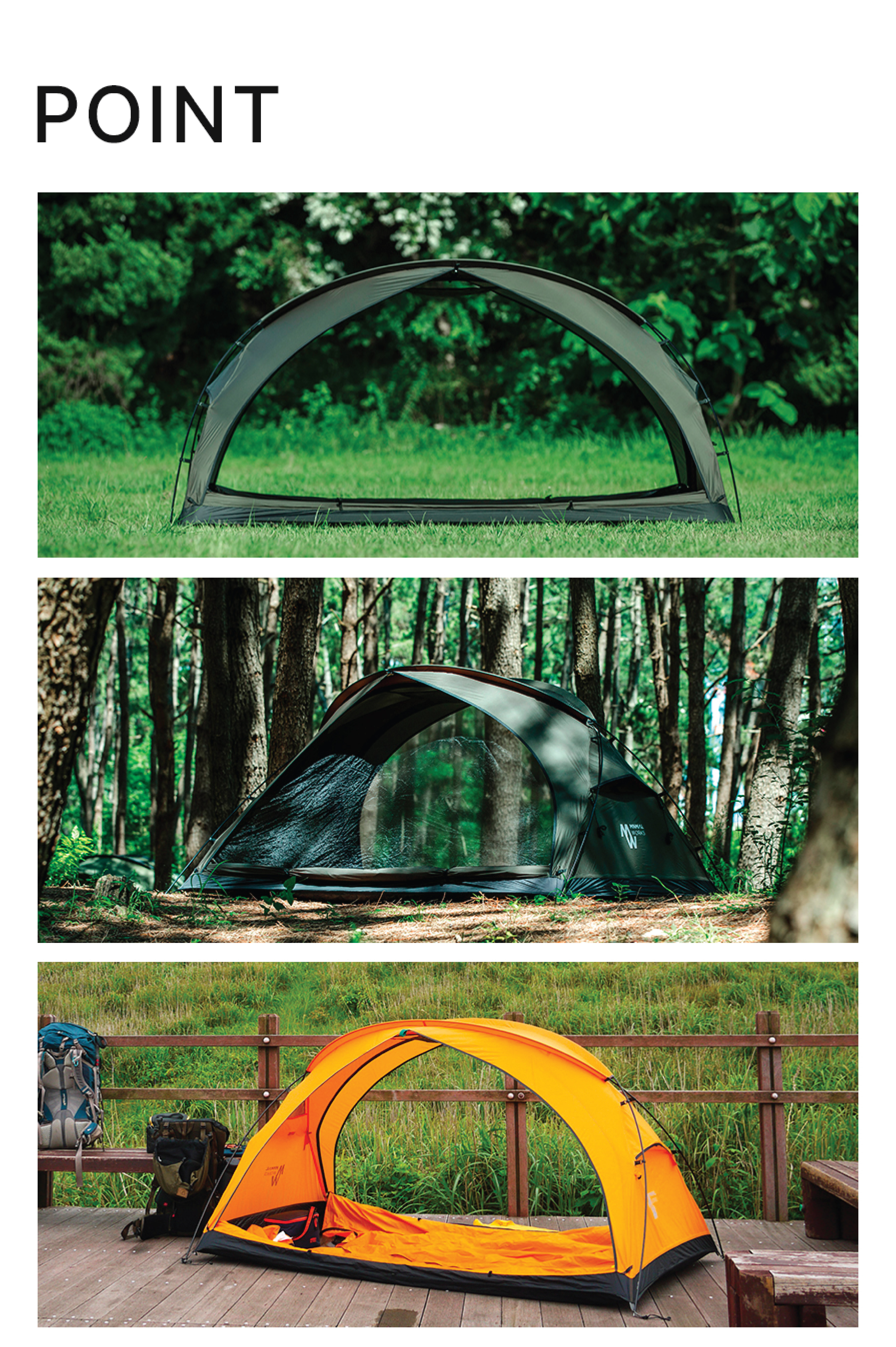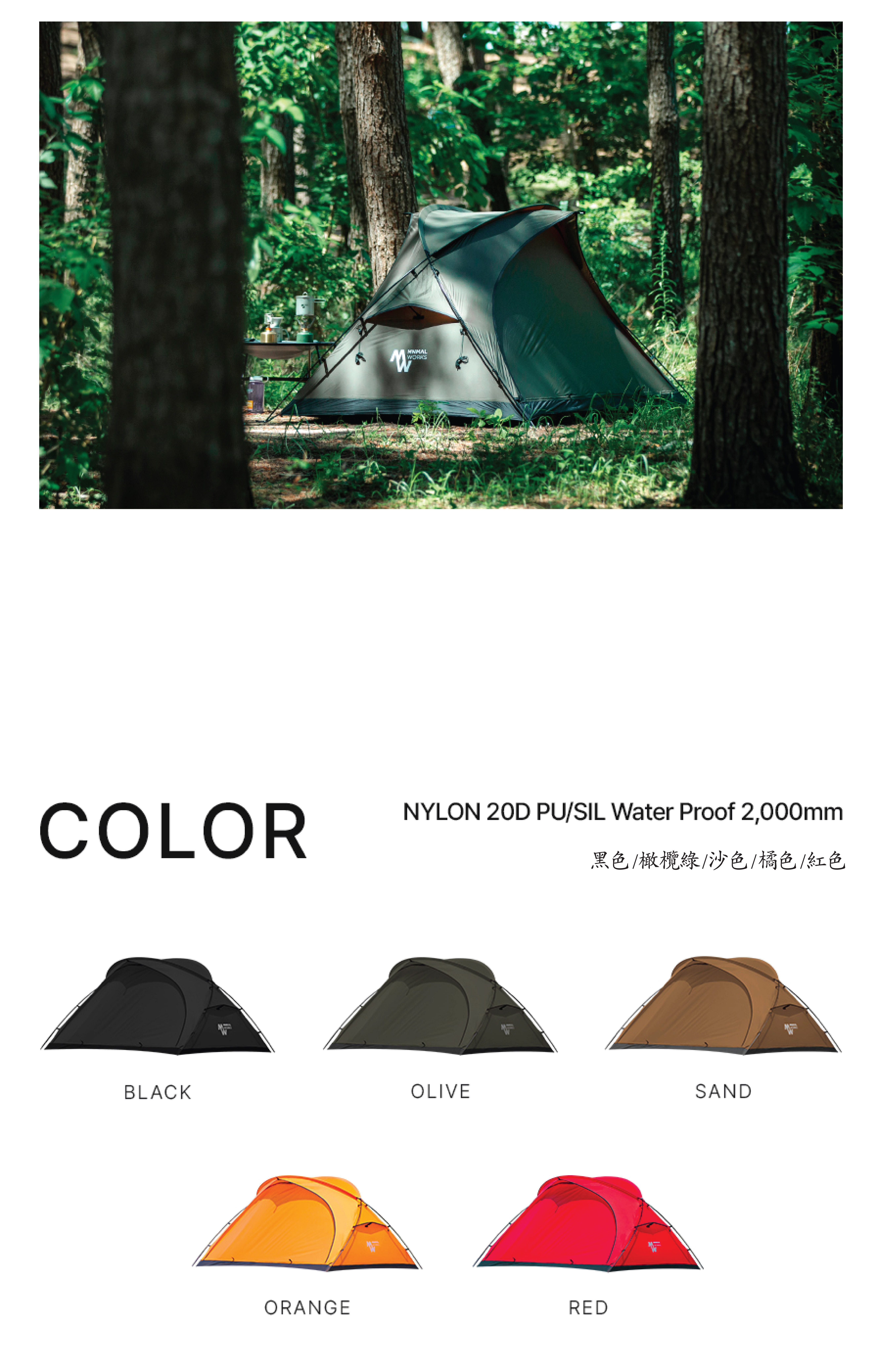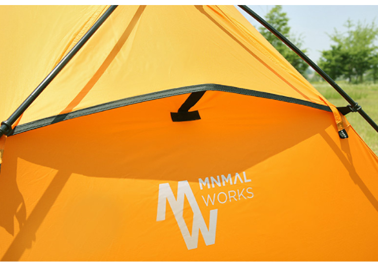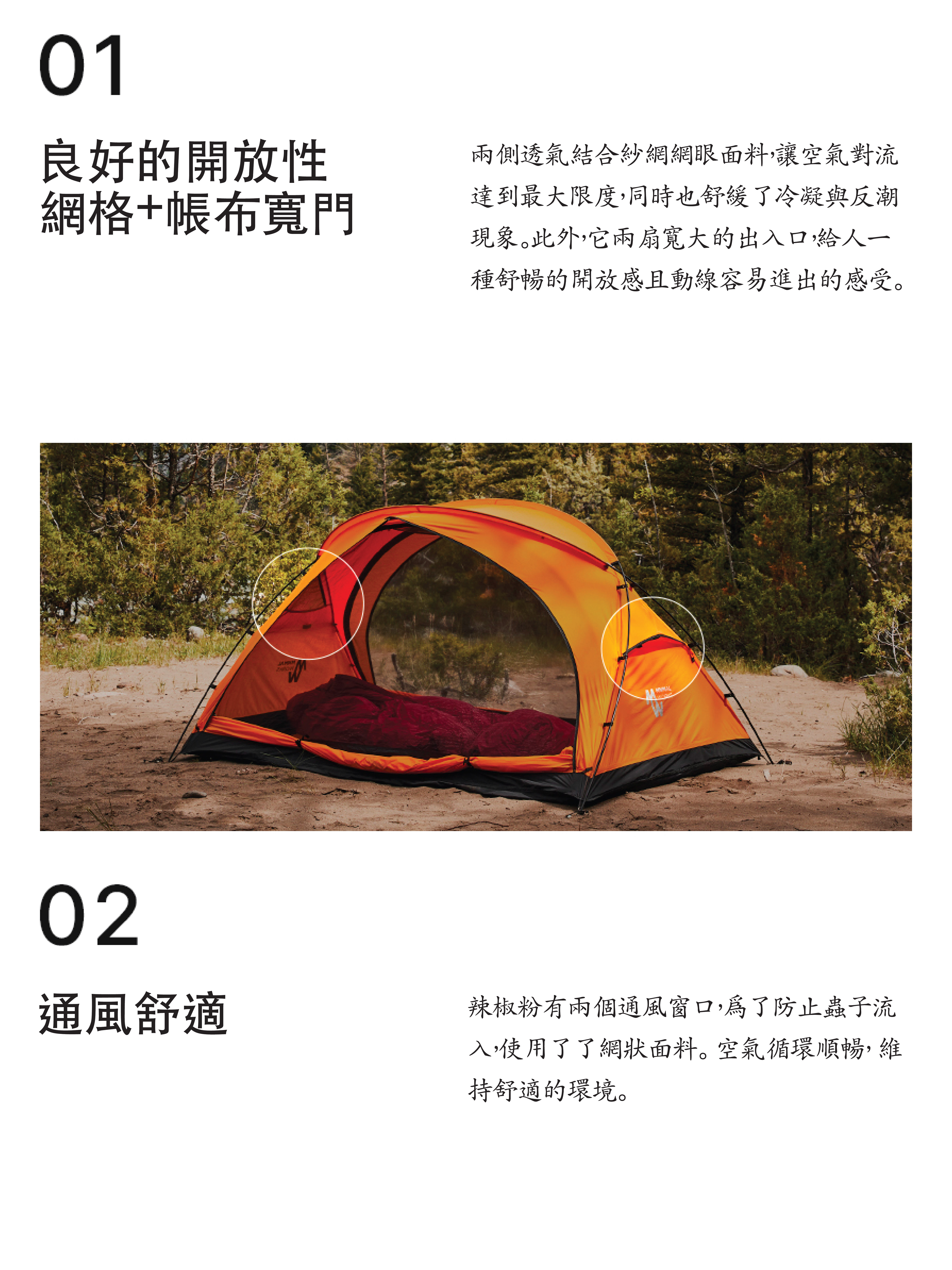 Minimal Works 辣椒粉自立帳採用尼龍20D PU/SIL面料,兩側透氣結合紗網網眼面料,讓空氣對流達到最大限度,同時也舒緩了冷凝與反潮現象。此外,它兩扇寬大的出入口,給人一種舒暢的開放感且動線容易進出的感受。自推出以來,