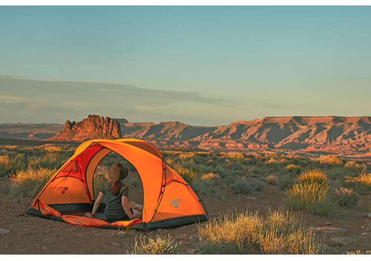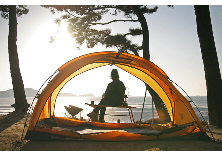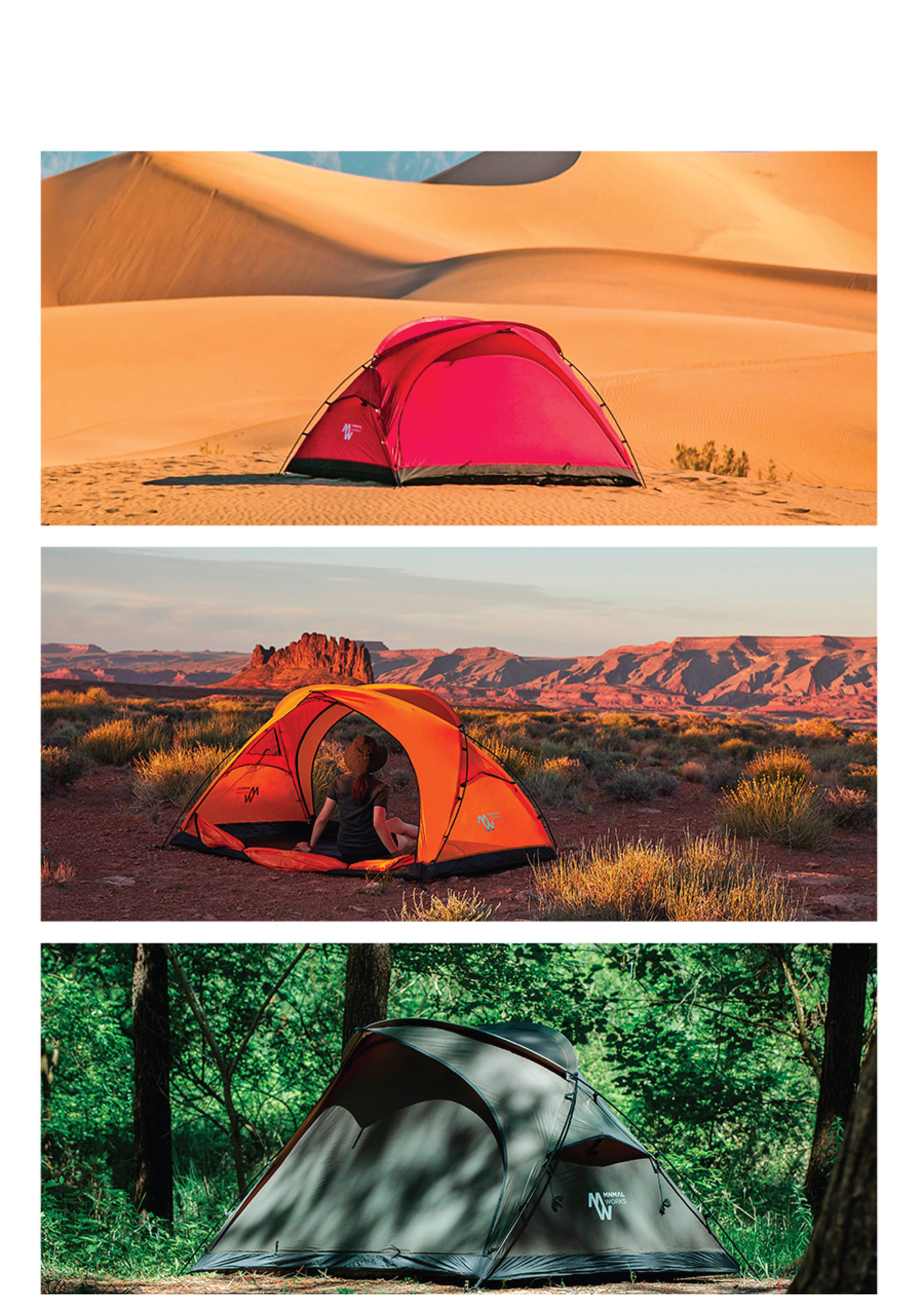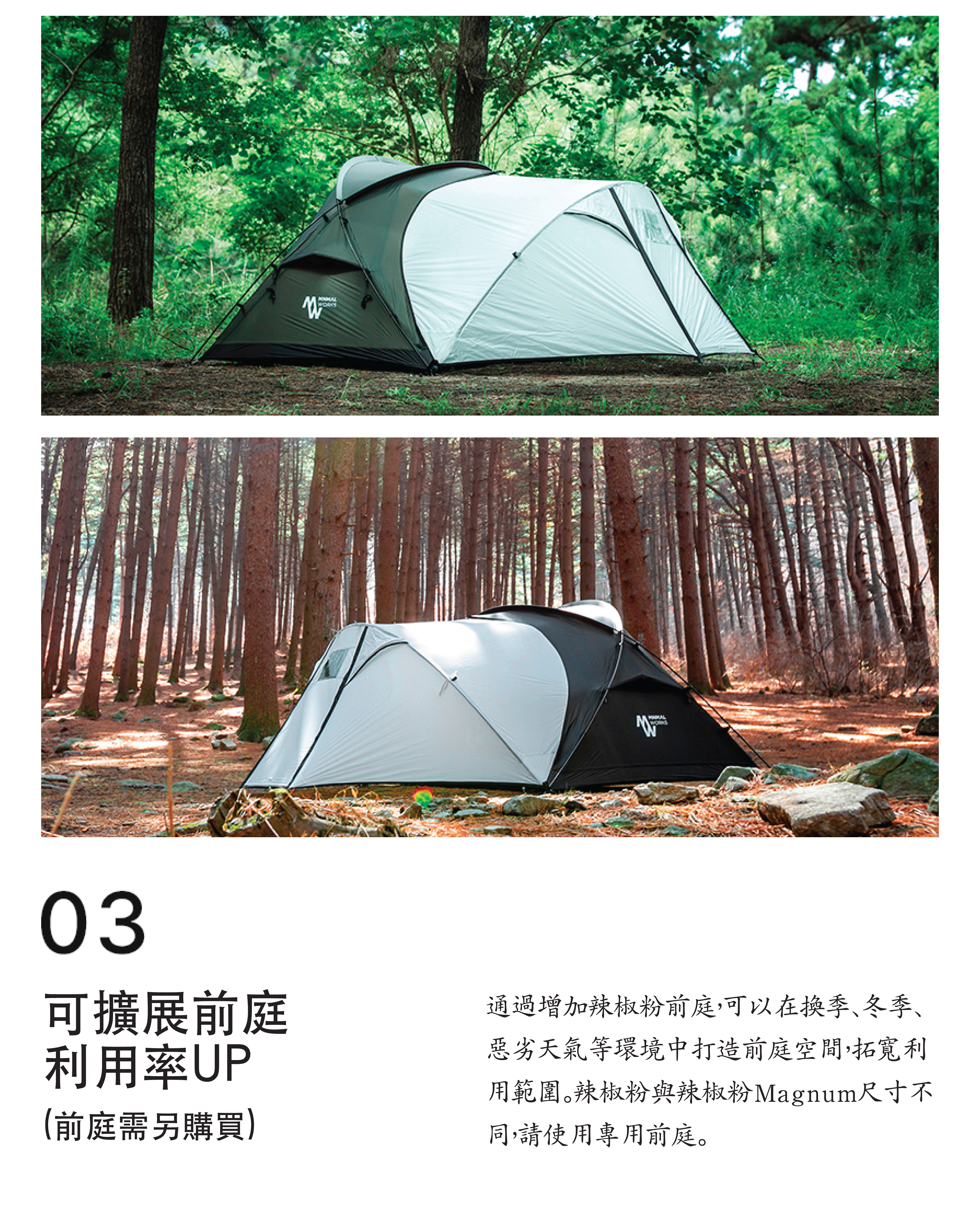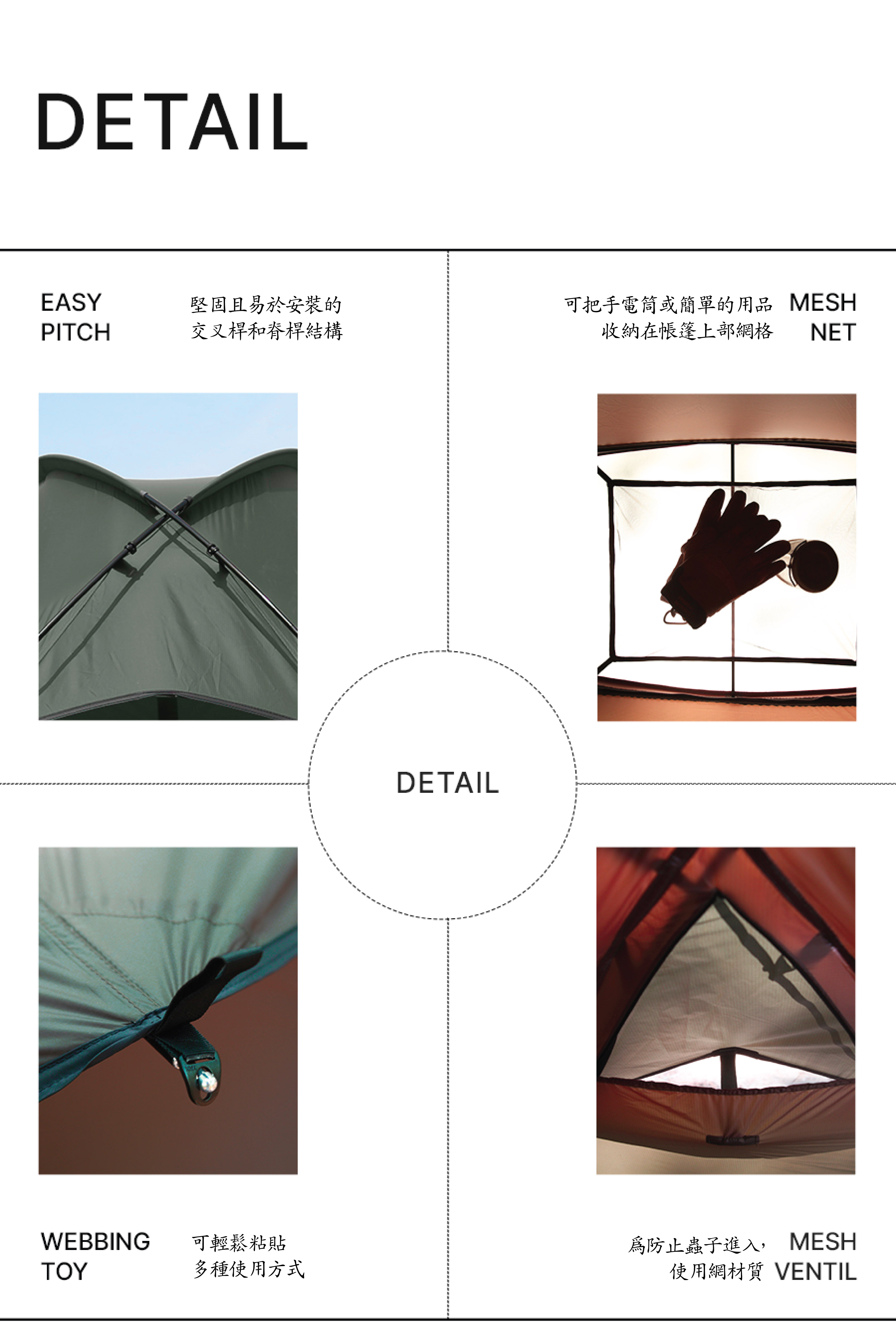 Minimal Works 辣椒粉自立帳採用尼龍20D PU/SIL面料,兩側透氣結合紗網網眼面料,讓空氣對流達到最大限度,同時也舒緩了冷凝與反潮現象。此外,它兩扇寬大的出入口,給人一種舒暢的開放感且動線容易進出的感受。自推出以來,