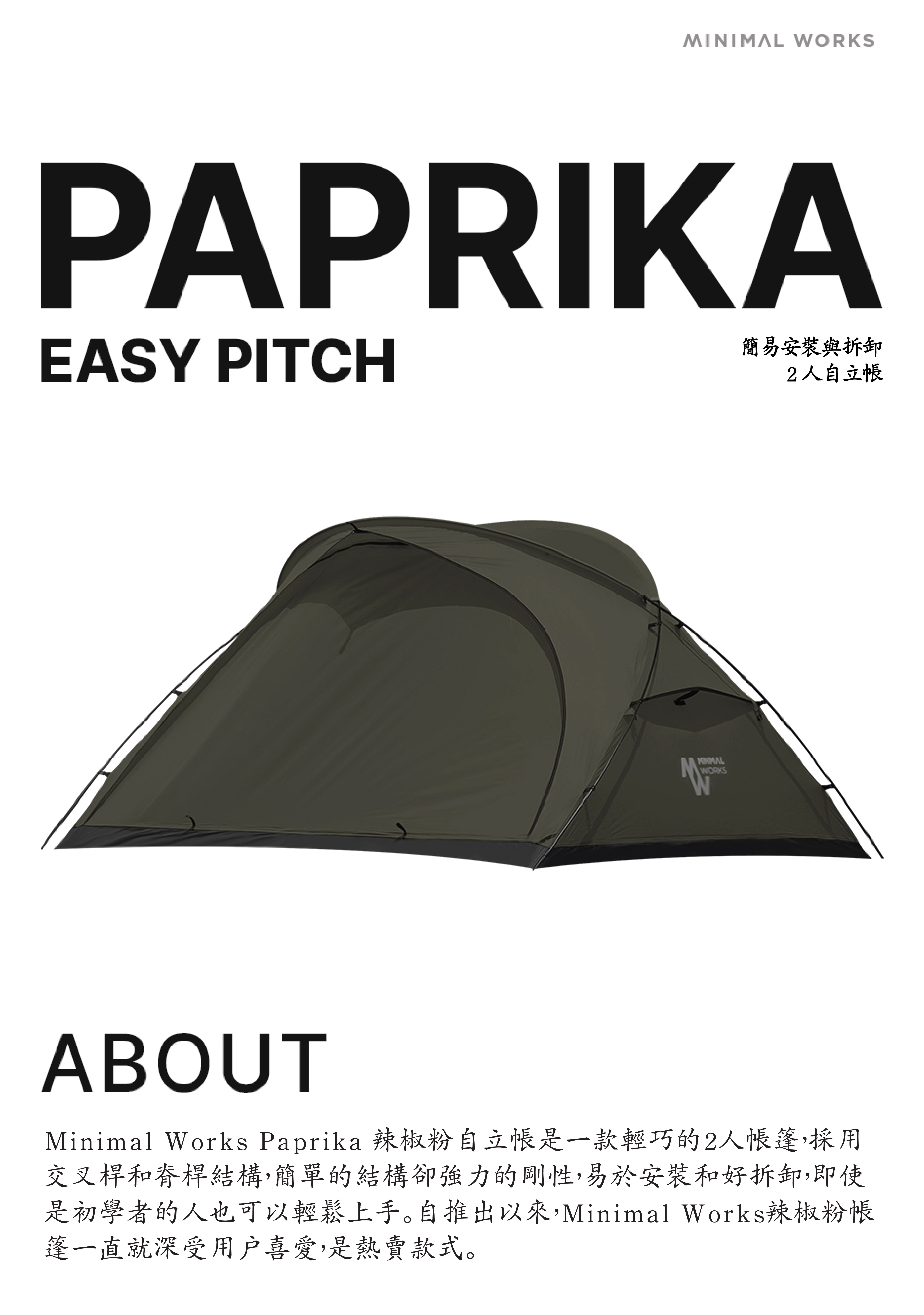 Minimal Works|Paprika|辣椒粉自立帳是一款輕巧的2人帳篷,採用交叉桿和脊桿結構,簡單的結構卻強力的剛性,易於安裝和好拆卸,即使是初學者的人也可以輕鬆上手。