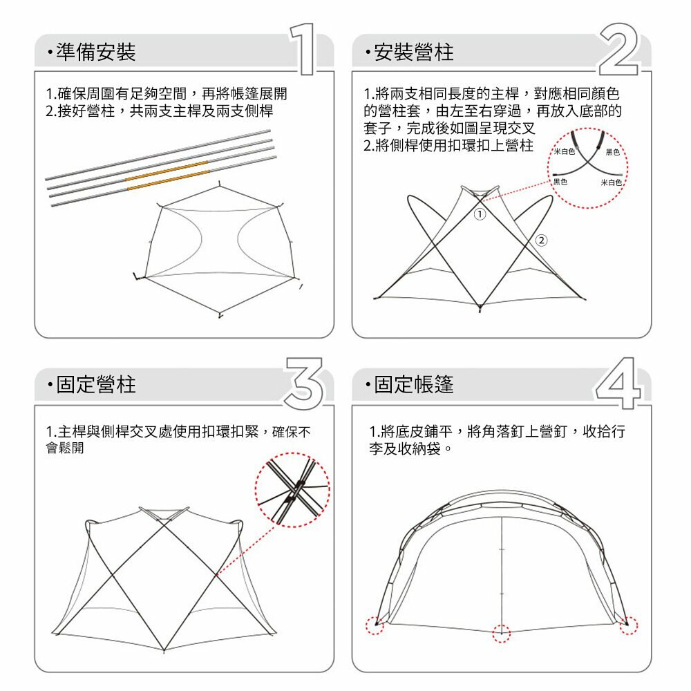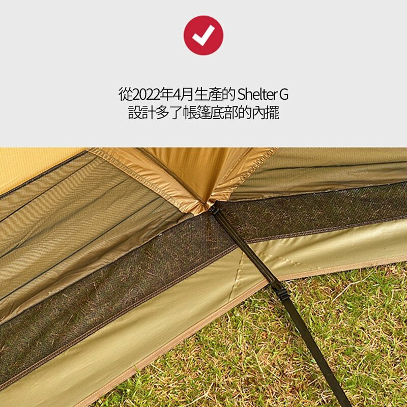 以多人、多功能團體庇護所的概念研發設計,可在戶外環境中容納多人。採用雙十字桿結構的自立式庇護帳,使用高耐度 Duralumin 硬鋁材料製成的兩個主桿和兩側桿結構,成為可獨立站立的自立帳型庇護帳,350 x300 x170 cm 規格, 安裝非常方便,可以搭設於各種大小的休閒森林棧板上,也很容易安裝在停車場式露營,是適合當成生活空間的庇護帳。兩側對稱的寬門給人一種寬闊舒爽的開放感,進出動線自由。天窗設計和位於兩側的四個通風孔都是網狀的,提供帳內順暢的空氣,無敵的庇護帳可以靈活應對各種環境和多重變化的氣象預報。
