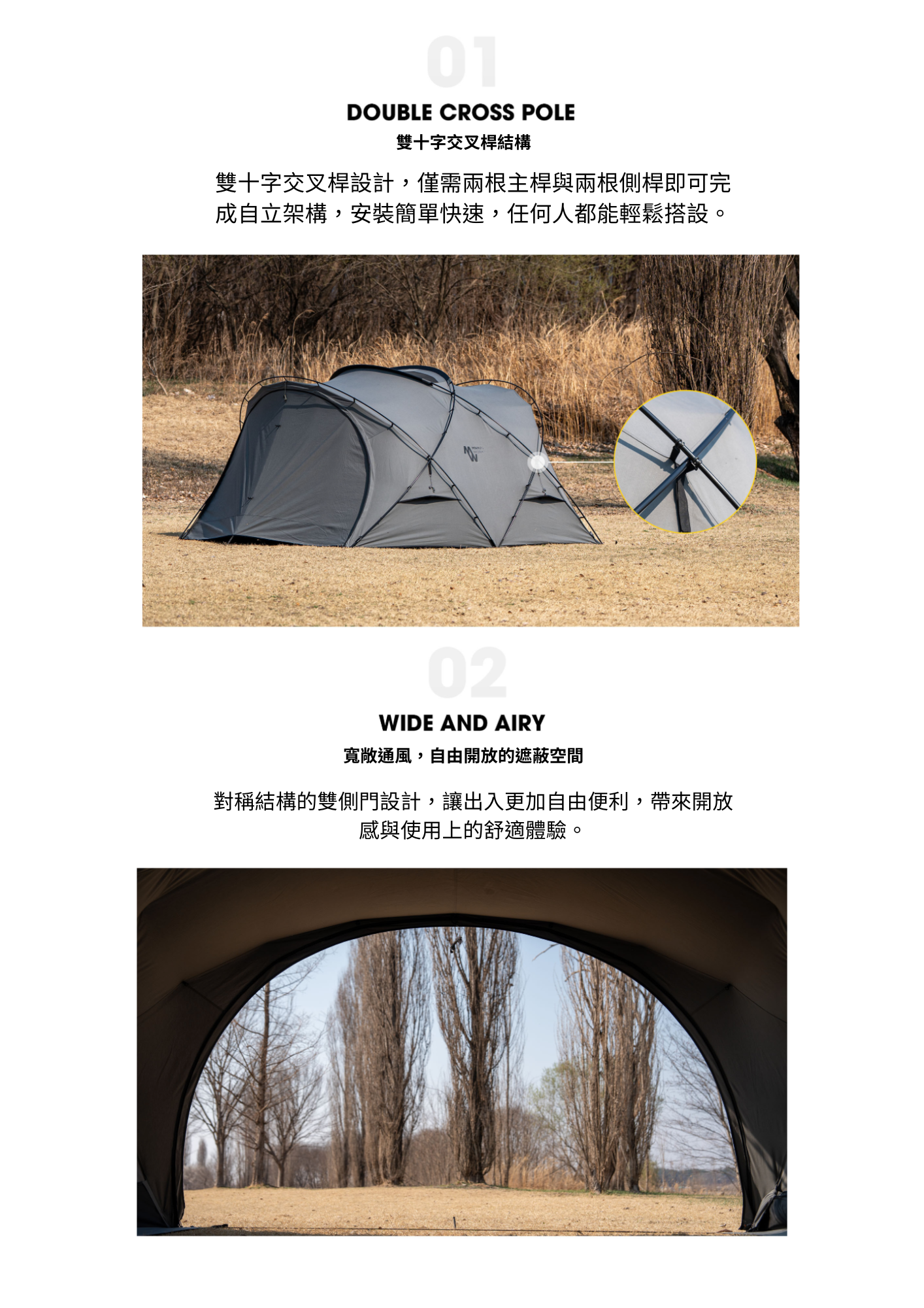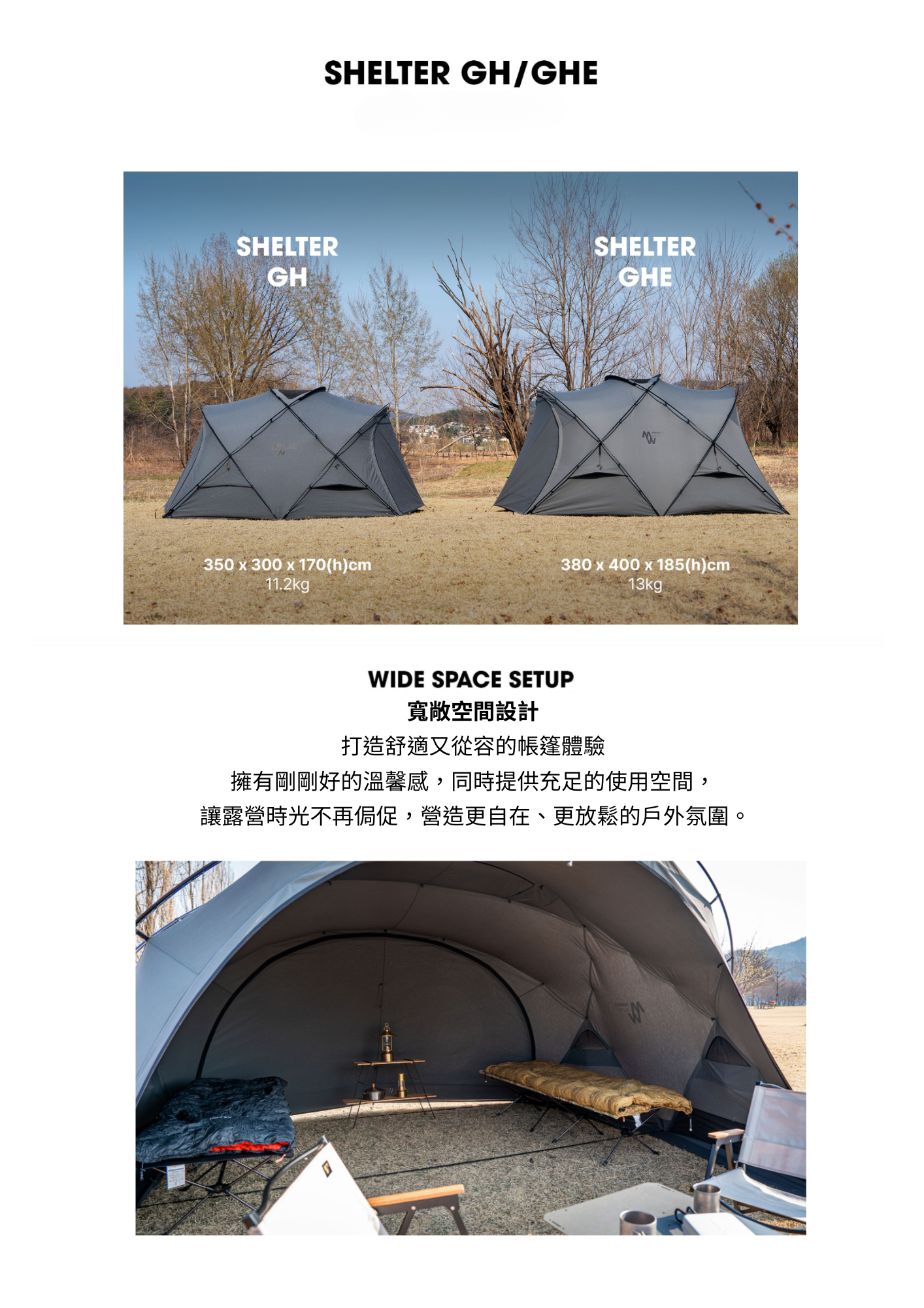 GHE 是在廣受好評的 GH 結構基礎上,全面升級尺寸與舒適度的進階版戶外遮蔽空間。從原本的 350×300×170(h)cm 擴大至 400×380×185(h)cm,不僅擁有更寬敞的使用面積與更高的高度,也保留了 GH 所具備的穩定性與便利性。無論是家庭露營、團體聚會,或是想要悠閒享受自然時光,GHE 都能帶來更從容自在的戶外體驗,是追求空間感與機能性的理想選擇。