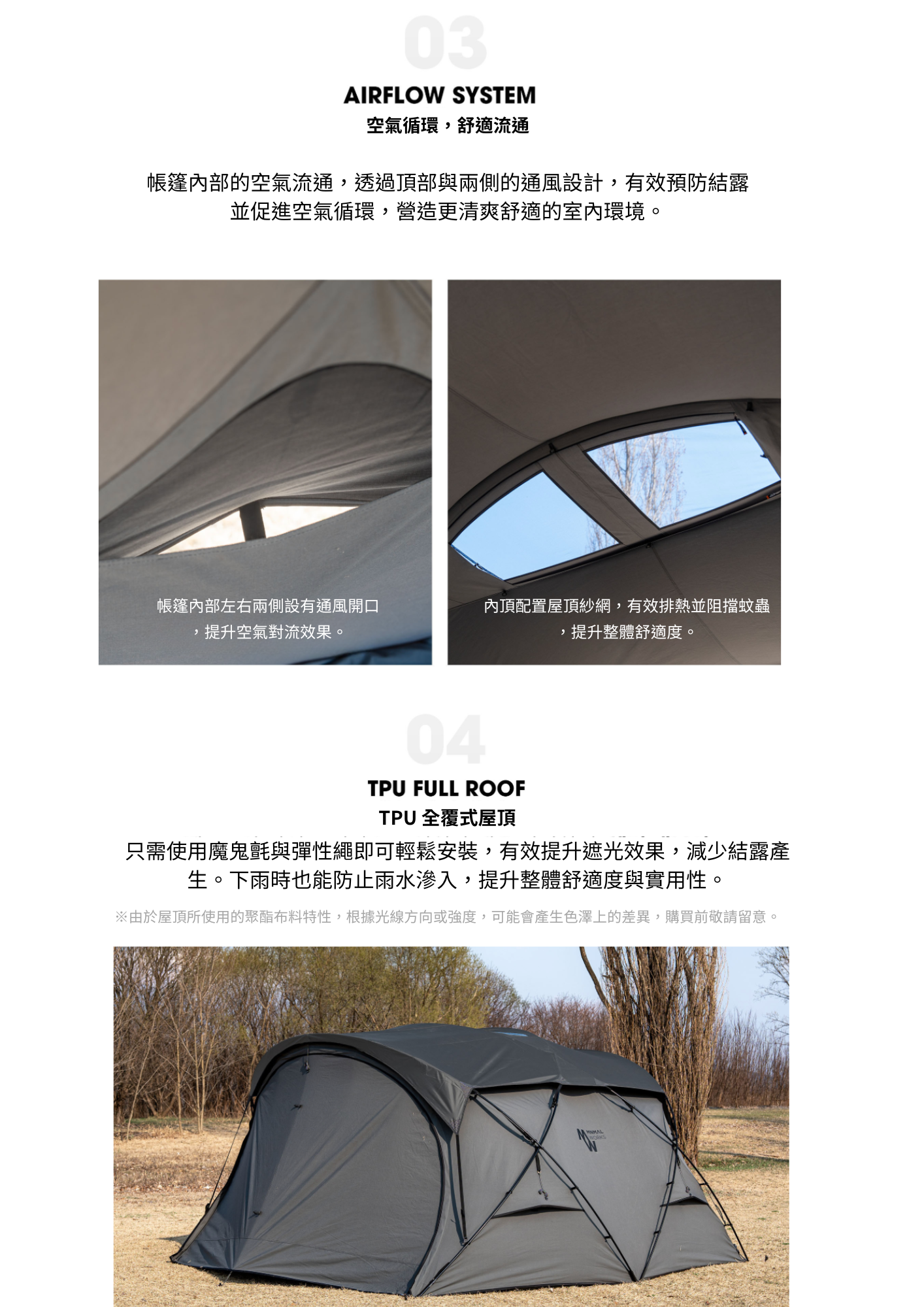 GHE 是在廣受好評的 GH 結構基礎上,全面升級尺寸與舒適度的進階版戶外遮蔽空間。從原本的 350×300×170(h)cm 擴大至 400×380×185(h)cm,不僅擁有更寬敞的使用面積與更高的高度,也保留了 GH 所具備的穩定性與便利性。無論是家庭露營、團體聚會,或是想要悠閒享受自然時光,GHE 都能帶來更從容自在的戶外體驗,是追求空間感與機能性的理想選擇。
