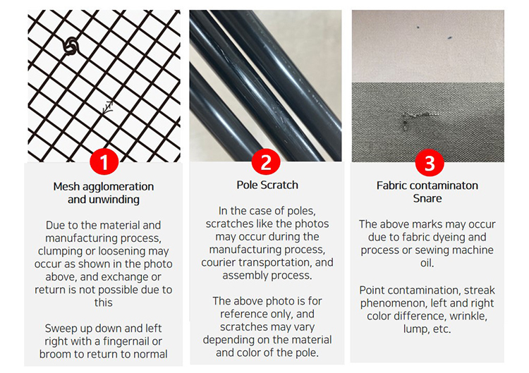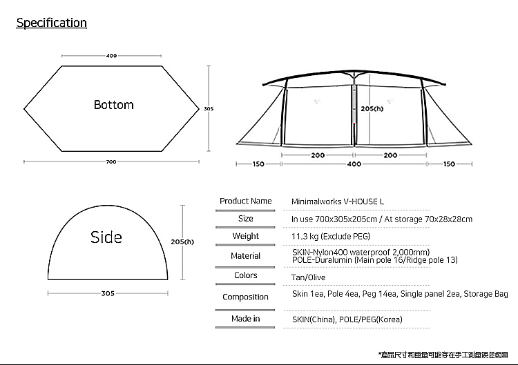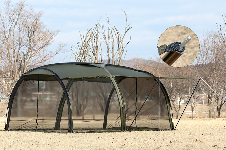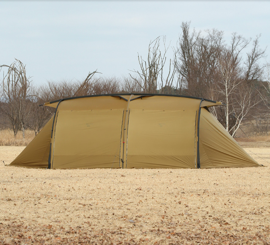 V House L 的營柱為 3 根直徑 16cm 的主支撐桿和 1 根直徑 13 公分的脊桿所構成,採用硬鋁材料,輕巧強韌,具備相當出色的耐用性和耐磨性。硬鋁本身是飛機的主要零件,抵抗衝擊時變形度小,彈性佳,具良好的緩衝效果。強度與剛才相同,但重量僅其 1/3 的超輕材料。在韓國製造的營柱為啞光設計。我們希望減少因陽極氧化表面處理過程中所使用或產生的有害物質,並使用對自然環境友好的材料創造生態有好的生態環境。