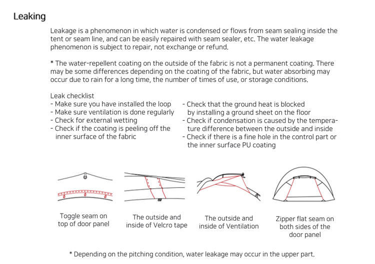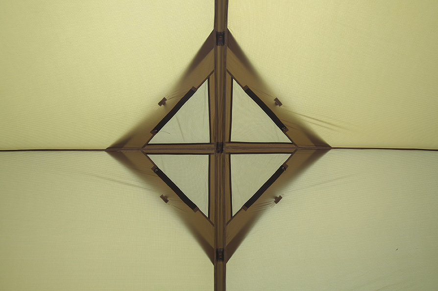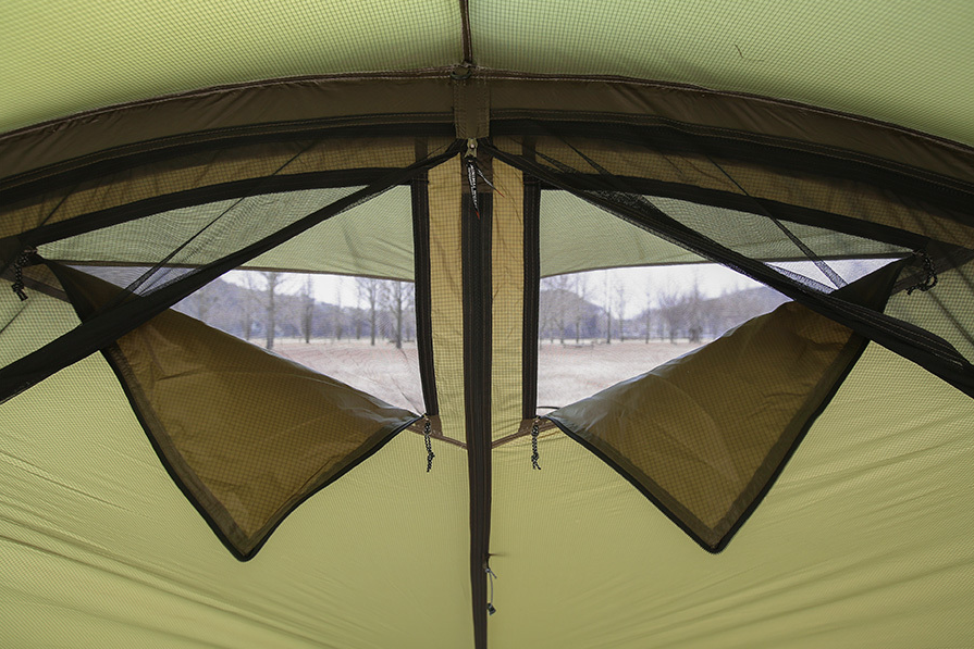 帳篷頂部和側面的通風裝置採用網眼織物,有效防止昆蟲蚊蟲進入,並配有拉鍊,使其更容易開打開與閉合。考慮到功能性和設計性,我們混合使用了防水拉鍊和一般拉鍊,以改進帳篷功能和設計。