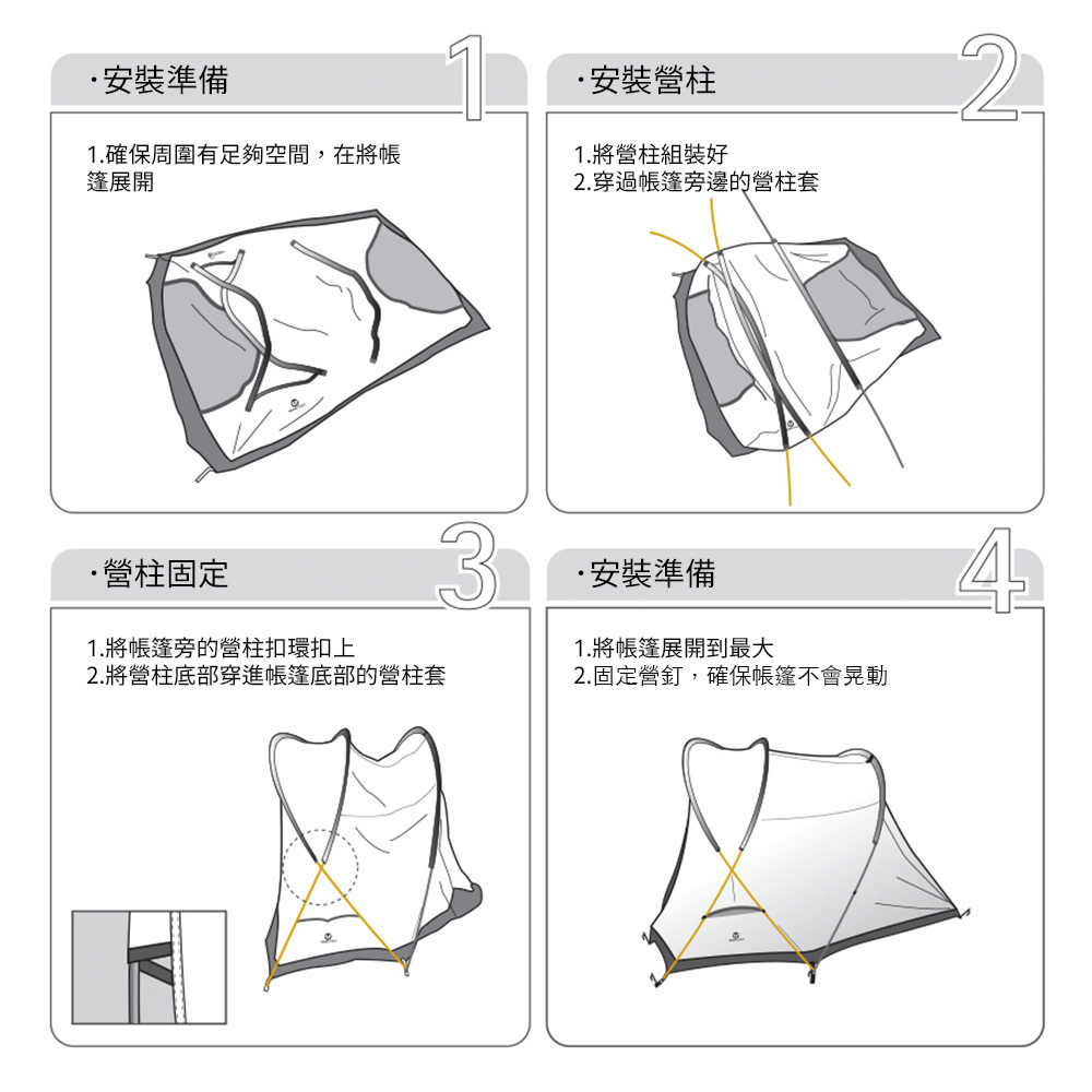 內容物:Raum 2.0棉質自立帳x1、營柱x3、營釘x8、收納袋 x1