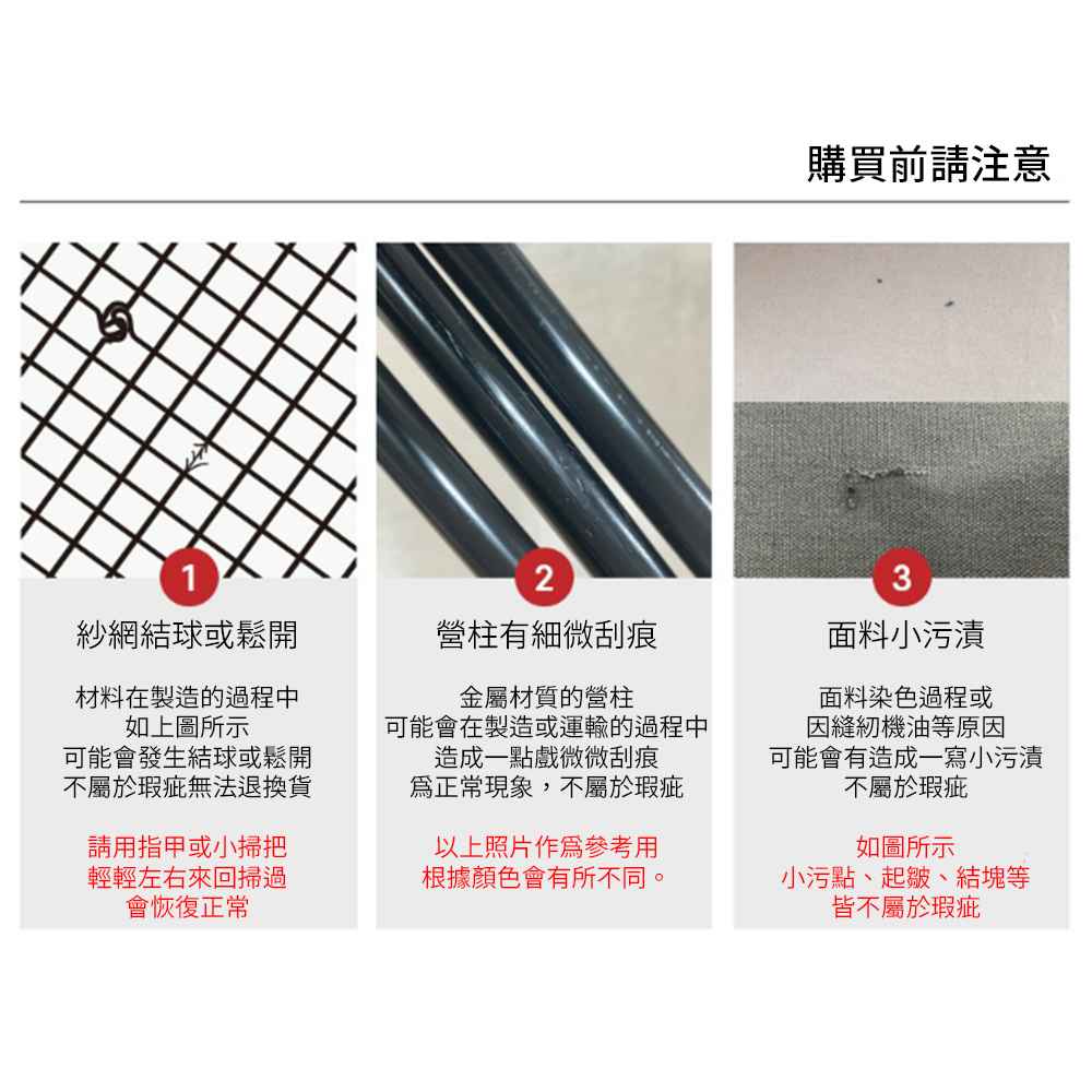 如果由於布料或縫紉線而發生滲漏,是因為棉織物與滌綸或尼龍織物的特性不同所致,並非缺陷。如果帳篷織物持續暴露在雨水或濕氣中,棉質布料表面會吸水,可能會導致洩漏。在棉布料的編織過程中,可能會出現接縫,但這是製作時的正常現象,並不是產品瑕疵或缺陷。 由於灰塵或髒污等外部污染,可能會在隨雨水或露水流動,在表面留下痕跡。 上述現像是由於使用環境或織物的性質而產生的,並不是材質或產品瑕疵造成的。購買前請仔細閱讀。