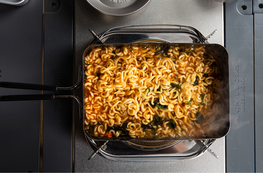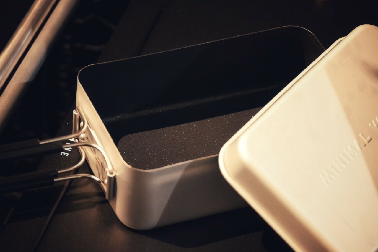 直火午餐盒的重量輕巧、容易收納存放。深度有足夠的容量煮兩碗拉麵。折疊手把設計,可以左右摺收和展開。鋁製的飯盒鍋具,具有絕佳的導熱性,而萬用的黑色煮盒上,塗有日本製造的特氟龍塗層,可有效防止食物沾黏。