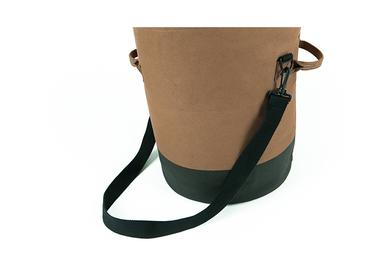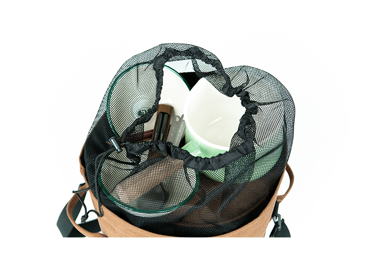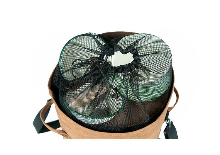 圓柱收納袋使用堅韌、堅固、防潮和防污染的面料。在實用性、美觀、收納使用和移動的便利性上,表現都非常出色,此外,在袋頂覆蓋有網眼和繩扣的裝置,因此即使裝滿東西,也不用擔心會掉落。