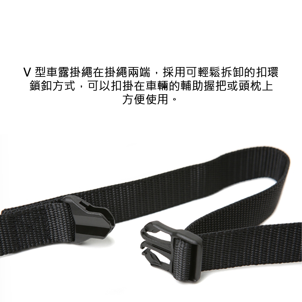 V 取自於 Vehicle 的 V,意指汽車型等交通工具的概念使用。V 型車露掛繩,則為有效利用車內空間使用率而誕生,其結實牢固的織帶上,共有15 個孔洞,利用掛鉤可方便懸掛露營物品或燈飾等。
