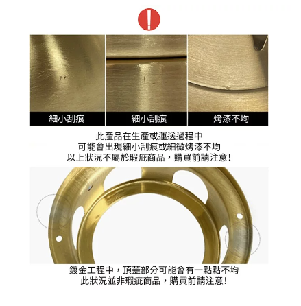 • 部分材質塗層、漆性、電鍍加工處理,難免存在色層紋路或是漆料微溢等情況,皆屬正常製作,非商品瑕疵範圍,不屬於瑕疵品,售出後,無法提供退費與退換費服務。